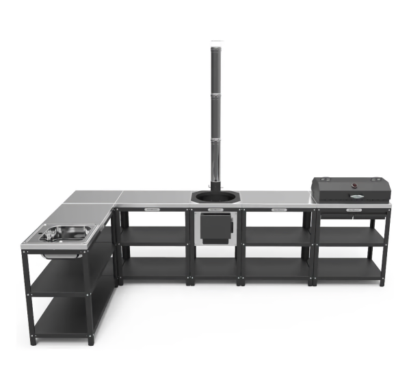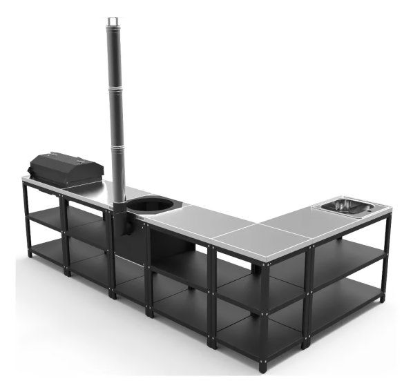 стол - 2 шт., печь, дымоход, мангал, крышка, решётка-гриль, разделочный стол - 4 шт., мойка, выпуск, сифон, крепёж