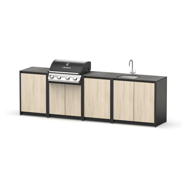 Гарнитур уличной кухни Cronon Lounge — идеальное решение для комфортного отдыха на свежем воздухе! Благодаря водонепроницаемым материалам (HPL-каркасу и столешнице) выдерживает любые погодные условия. Регулируемые ножки обеспечивают устойчивость даже на неровных поверхностях. Встроенная мойка из нержавеющей стали упрощает процесс готовки и уборки. Идеально дополнит территорию дачи или загородного дома.