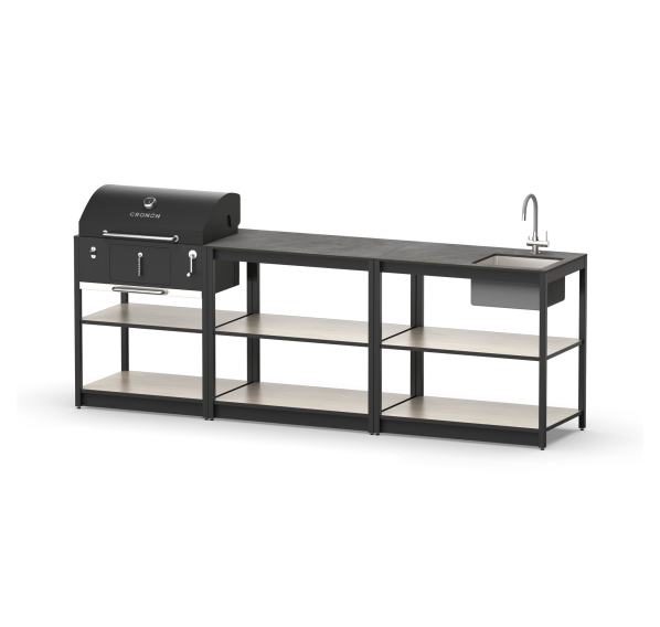 Преимущество таких конструкций: многофункциональность. В его комплектацию входят полноценная рабочая зона, мойка, множество мест для хранения и гриль на углях. Все это позволяет использовать мангальный комплекс барбекю без необходимости постоянно ходить в дом за всем необходимым.