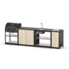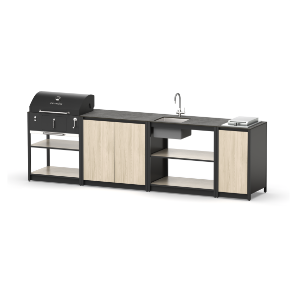 Преимущество таких конструкций: многофункциональность. В его комплектацию входят полноценная рабочая зона, мойка, множество мест для хранения и гриль на углях. Все это позволяет использовать мангальный комплекс барбекю без необходимости постоянно ходить в дом за всем необходимым.