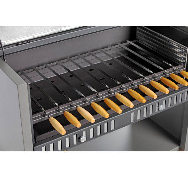 Крышка и боковины гриля термоизолированы, тем самым наружные части не нагреваются до высоких температур. Гриль дольше сохраняет тепло, и Вы сможете экономить уголь при эксплуатации. Гриль оснащён 4 заслонками, с помощью которых Вы можете регулировать температуру горения угля, причём делать это можно отдельно как в правой, так и в левой части гриля. Также в гриле Gratar Expert присутствует 8 положений регулировки высоты расположения решётки-гриль. Кстати, помимо решётки в комплект входит рамка для шампуров и кочерга с совком для чистки гриля.