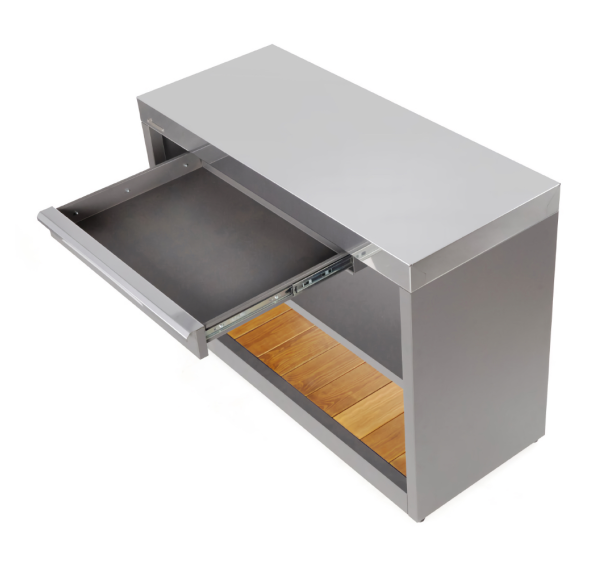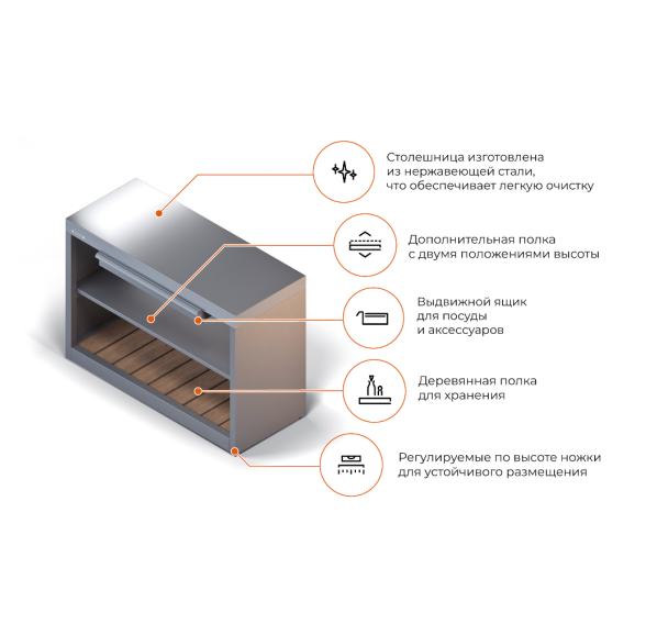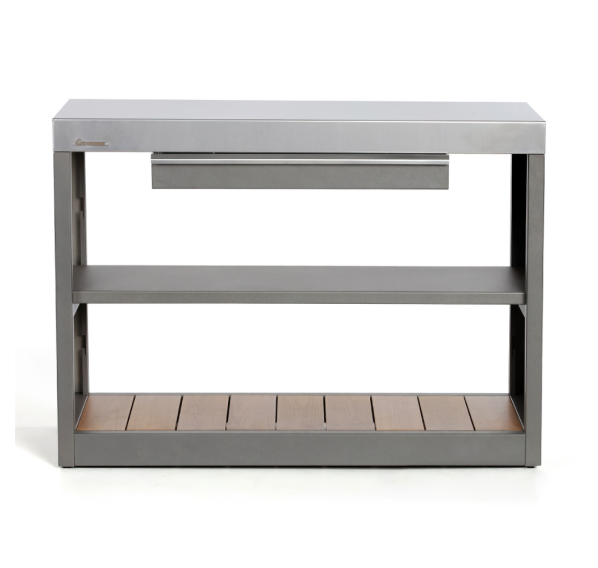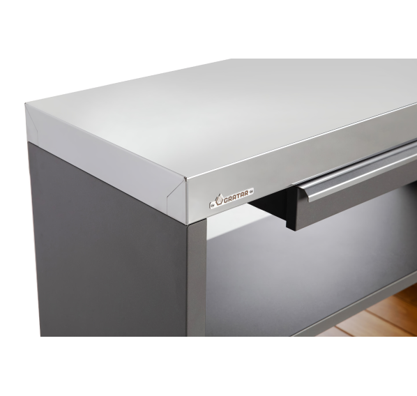 Стол Gratar Expert — это полноценное рабочее пространство уличной кухни. Долговечная столешница из нержавеющей стали и несколько полок позволят разместить всё необходимое для приготовления блюд. Для удобства хранения габаритных аксессуаров металлическая полка имеет два положения высоты. В стол интегрирован вместительный выдвижной ящик, в котором можно хранить необходимые инструменты.