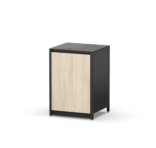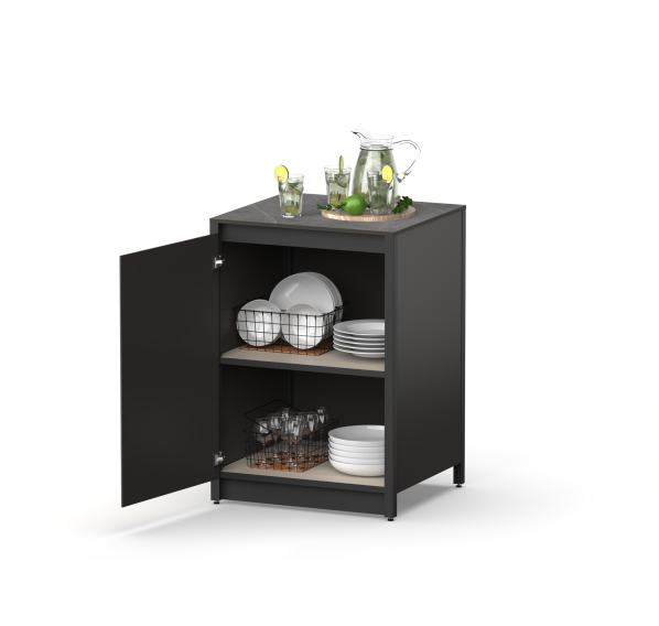 Он изготовлен из прочных материалов и отличается минималистичным дизайном. Алюминиевый каркас, влагостойкие столешница и фасад делают этот шкаф надёжным и функциональным. Ножки регулируются для максимально удобного использования.