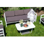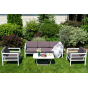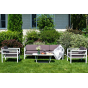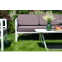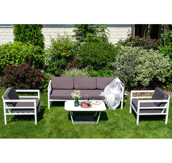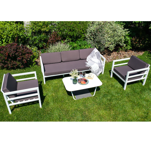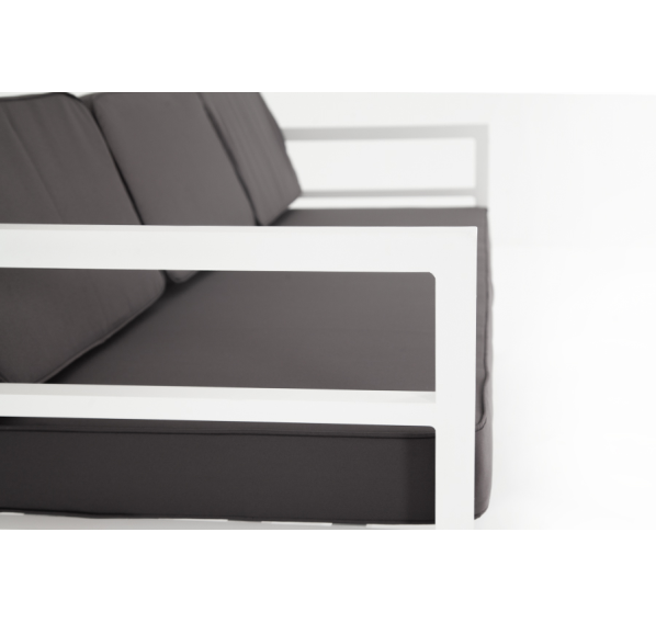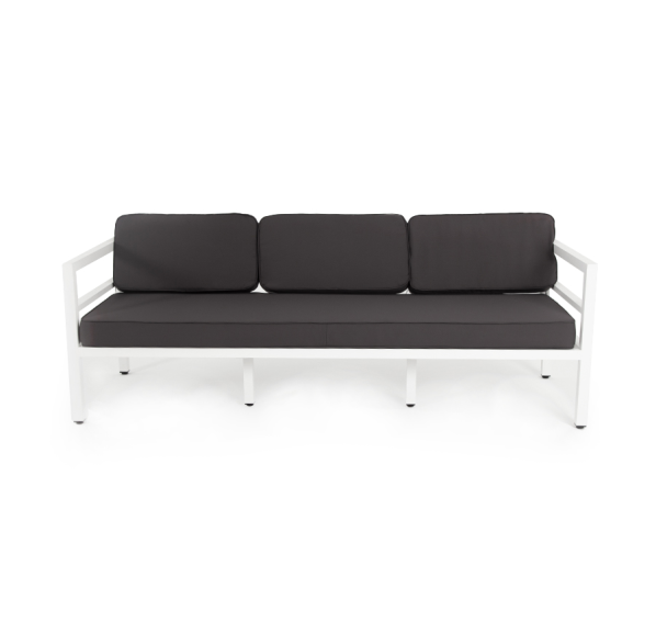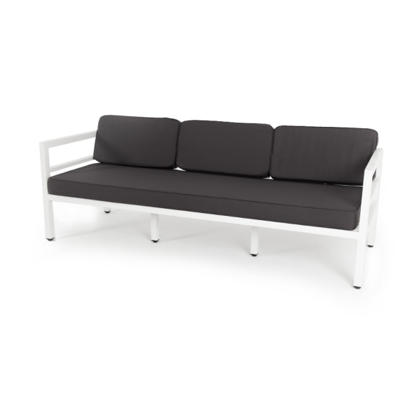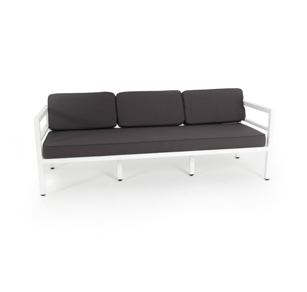 Трехместный диван «Эстелья». Каркас из алюминия, окрашенный в белый цвет, мягкие подушки на сидениях и спинках со съёмными чехлами темно-серого цвета.