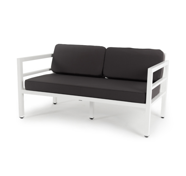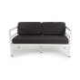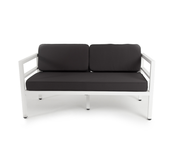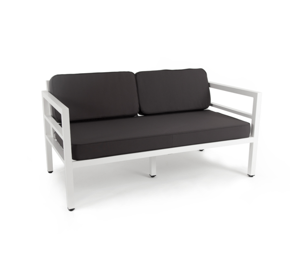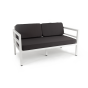 Стильный металлический диван «Эстелья» рассчитан на две персоны. Каркас изготовлен из легкого, но прочного алюминия, окрашенного в белый цвет порошковой краской. В копмлекте предусмотрены подушки темно-серого цвета со съёмными чехлами с влагоотталкивающей пропиткой.