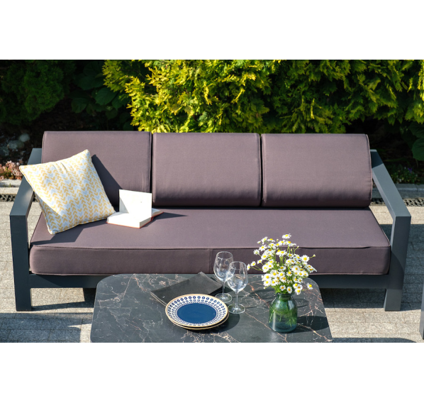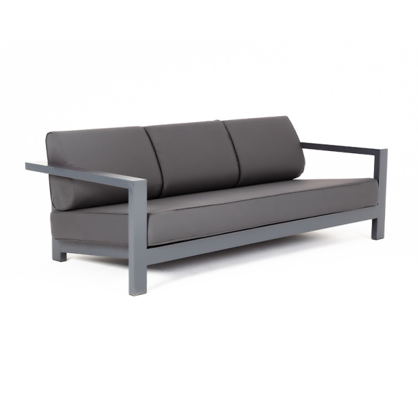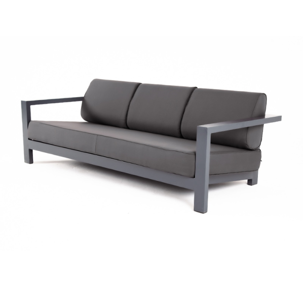 Стильный трехместный диван «Гранада» для обустройства зоны отдыха на балконе, в кафе или летней веранде. Каркас изготовлен из высокопрочного алюминия темно-серого (RAL7024) цвета.