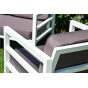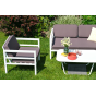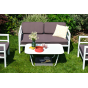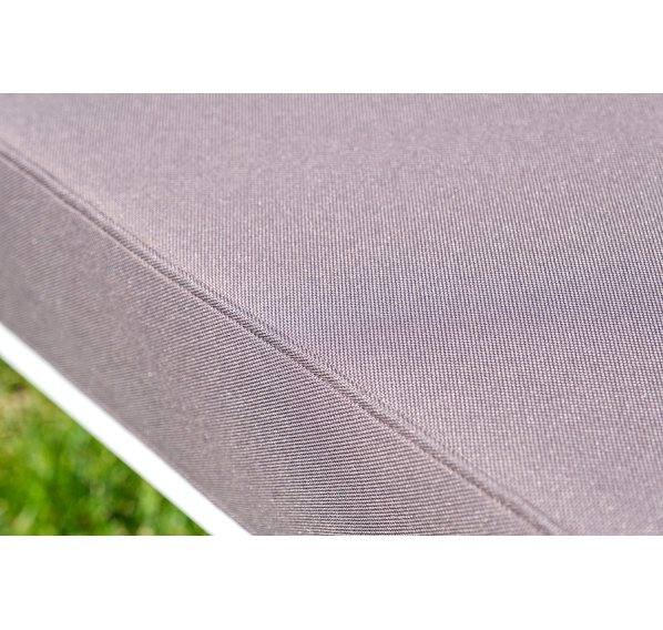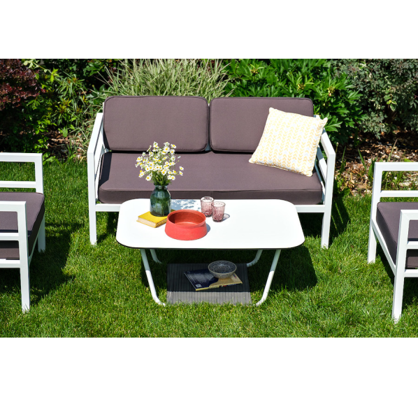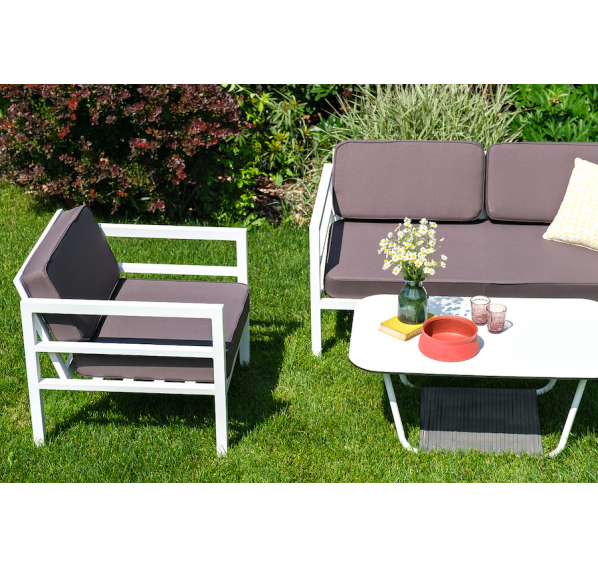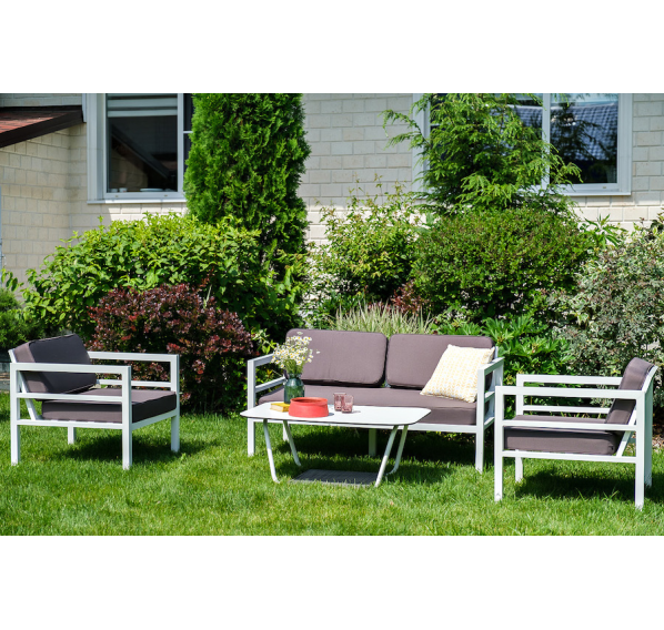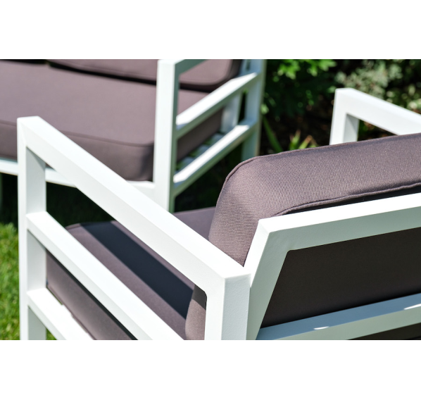 Каркас дивана и кресел выполнен из прочного алюминия и окрашен в белый цвет. Комплект дополняют подушки со съёмными чехлами и водоотталкивающей пропиткой. Материал чехлов - 100% полиэстер плотностью 300гр/м2.