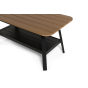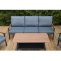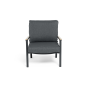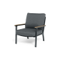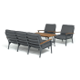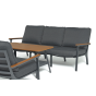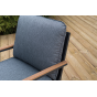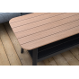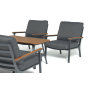 Каркас мебели выполнен из прочного алюминия темно-серого цвета. На подлокотниках дивана и двух кресел установлен облицовочный материал из древесно полимерного композита (ДПК) цвет «дерево». Крепление к каркасу осуществляется на болтах с пластиковыми заглушками темно-серого цвета, которые не ржавеют. Комплект дополняют подушки со съёмными чехлами. Материал чехлов - 100% полиэстер плотностью 190гр/м2.