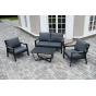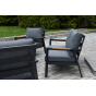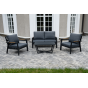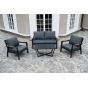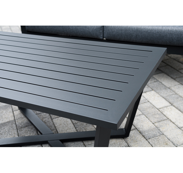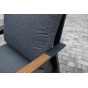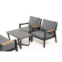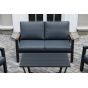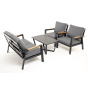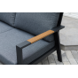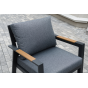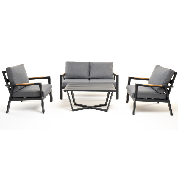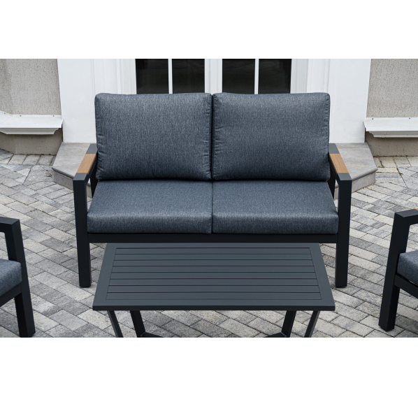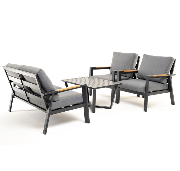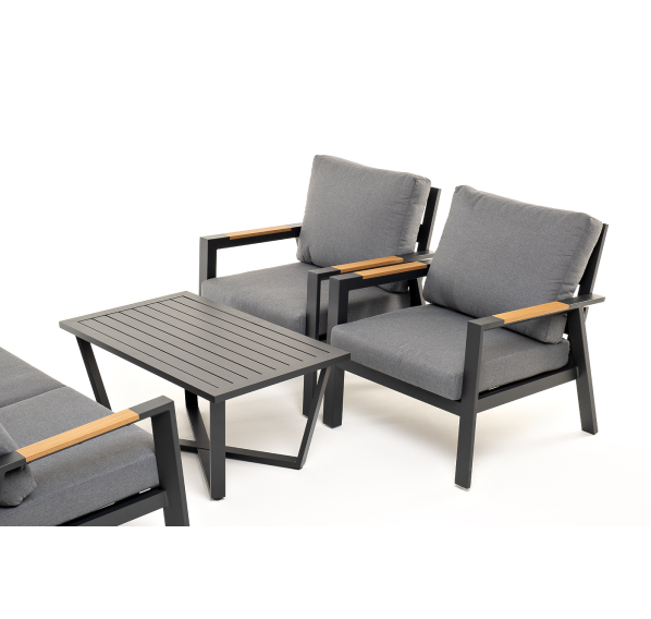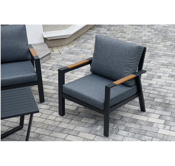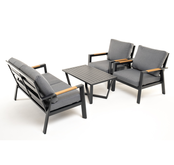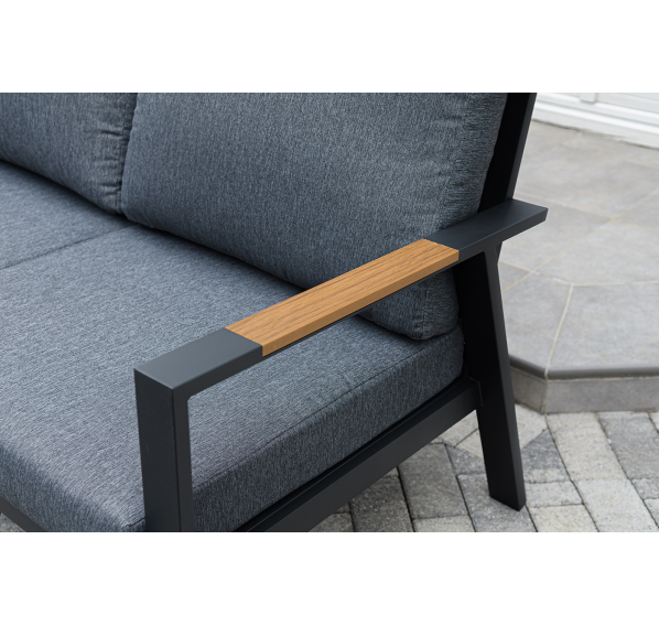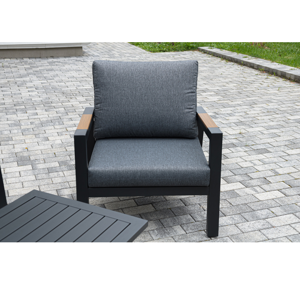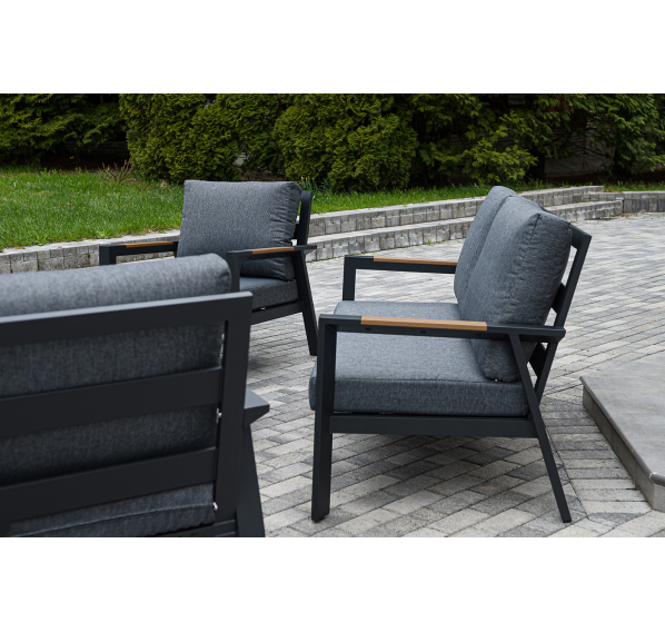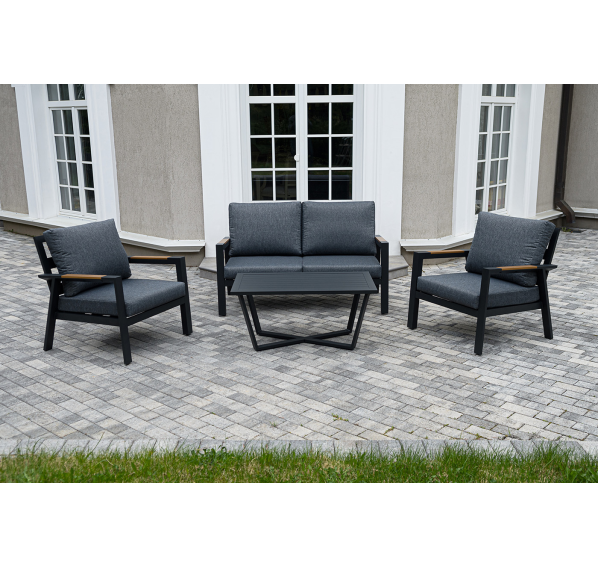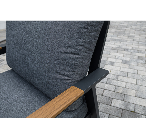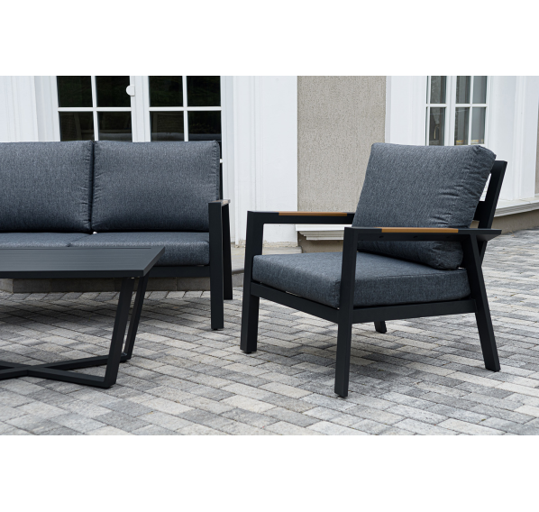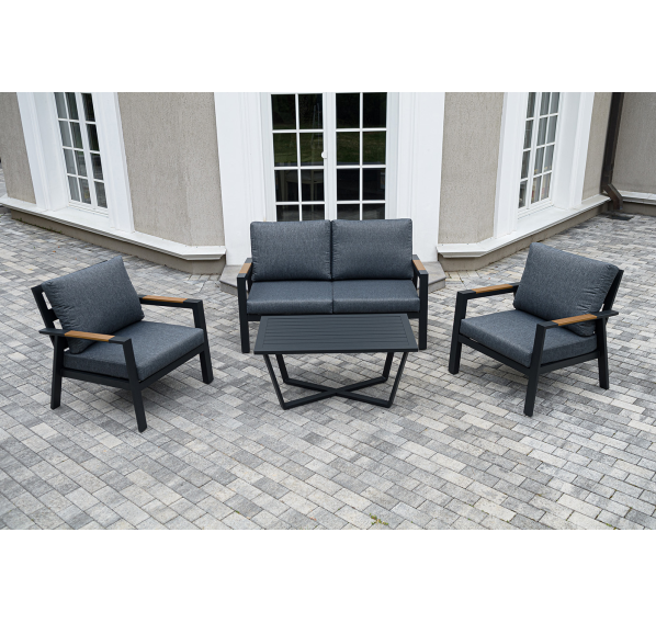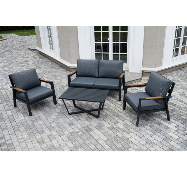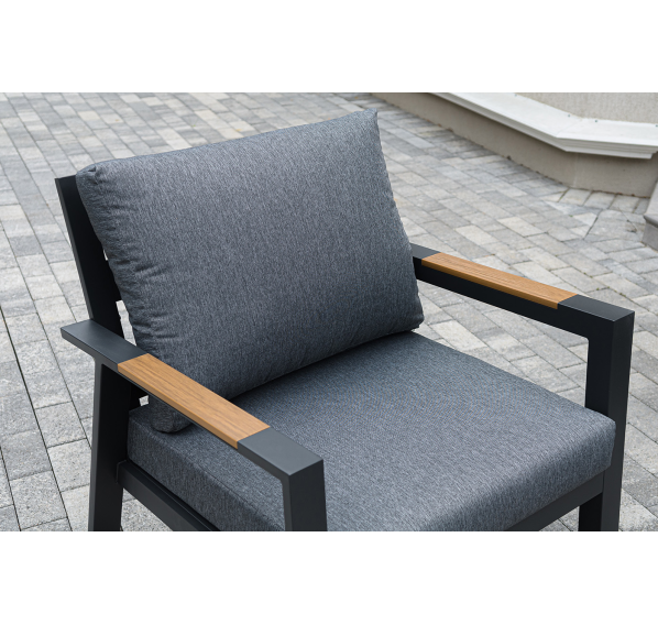 Каркас мебели выполнен из прочного алюминия темно-серого цвета. На подлокотниках дивана и двух кресел установлен облицовочный материал из древесно полимерного композита (ДПК) цвет «дерево». Крепление к каркасу осуществляется на болтах с пластиковыми заглушками темно-серого цвета, которые не ржавеют. Комплект дополняют подушки со съёмными чехлами. Материал чехлов - 100% полиэстер плотностью 190гр/м2.