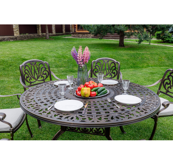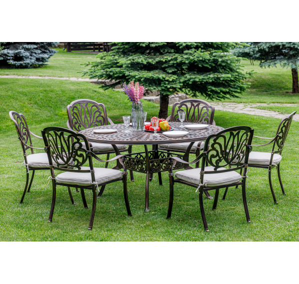 Эргономичный дизайн кресел обеспечивает комфортное сидение, а стильное исполнение придаст вашему саду или террасе особый шарм. Круглый стол с элегантным дизайном и прочной столешницей идеально дополнит общий вид комплекта.
