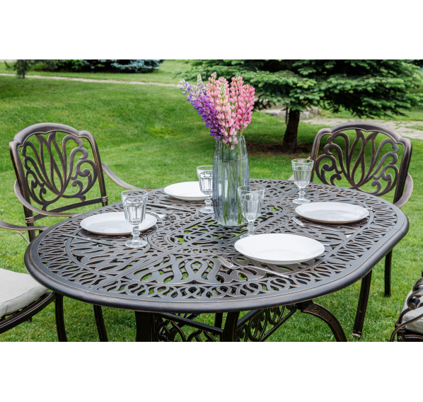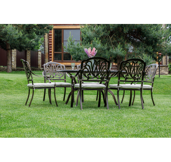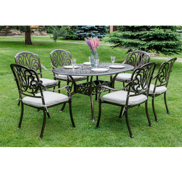 Эргономичный дизайн кресел обеспечивает комфортное сидение, а стильное исполнение придаст вашему саду или террасе особый шарм. Овальный стол с элегантным дизайном и прочной столешницей идеально дополнит общий вид комплекта.