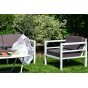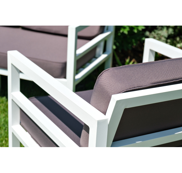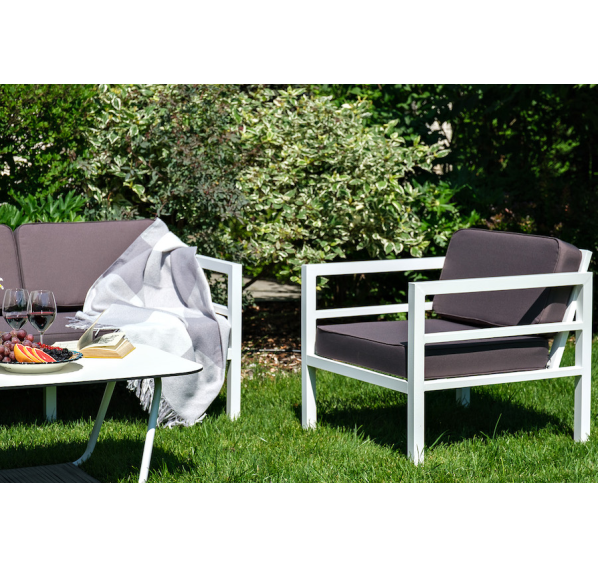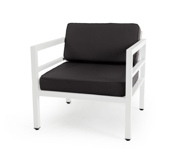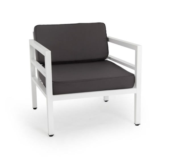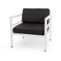 В комплекте на сидениях и спинке предусмотрены подушки контрастного темно-серого оттенка со съёмными чехлами. Строгое лаконичное кресло подходит для использования на открытом воздухе и в помещении, в том числе и в зоне повышенной влажности.