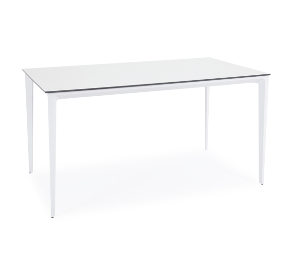 Столешница выполнена из современного высококачественного монолитного компакт-пластик HPL, толщиной 12 мм в молочном цветом. Материал устойчив к высоким температурам, попаданию влаги и может использоваться при любых погодных условиях. Подстолье изготовлено из крашеного алюминия белого цвета.