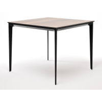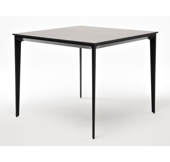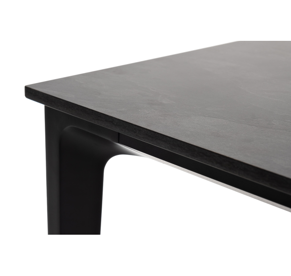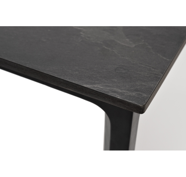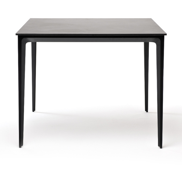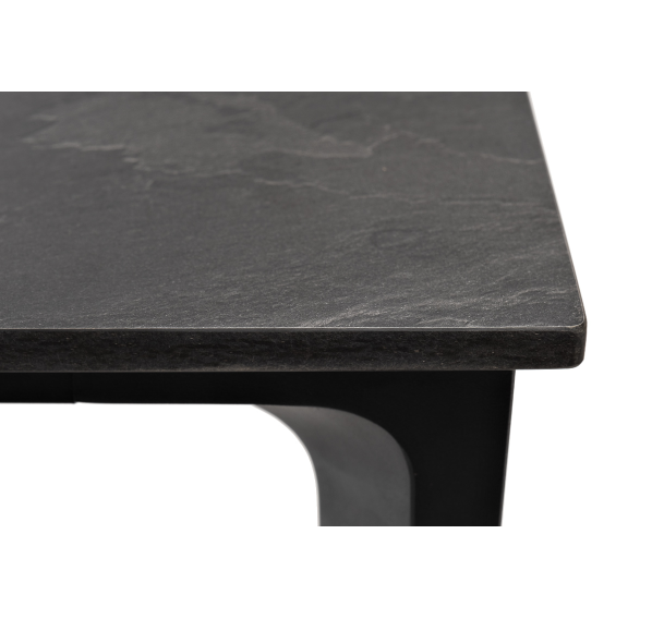 Столешница выполнена из современного высококачественного монолитного компакт-пластик HPL, толщиной 12 мм в цвете «серый гранит». Материал устойчив к высоким температурам, попаданию влаги и может использоваться при любых погодных условиях. Подстолье изготовлено из крашеного алюминия черного цвета.