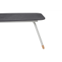 Каркас столика изготовлен из алюминия, окрашенного в светло-серый цвет. Алюминий является легким и прочным материалом, что обеспечивает долговечность и надежность изделия. На ножках столика идут дубовые наконечники (заглушки).