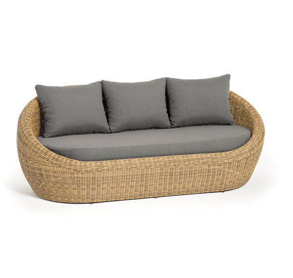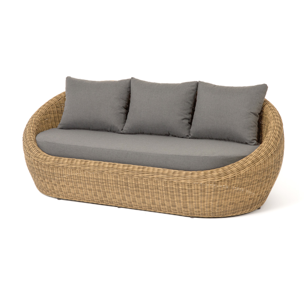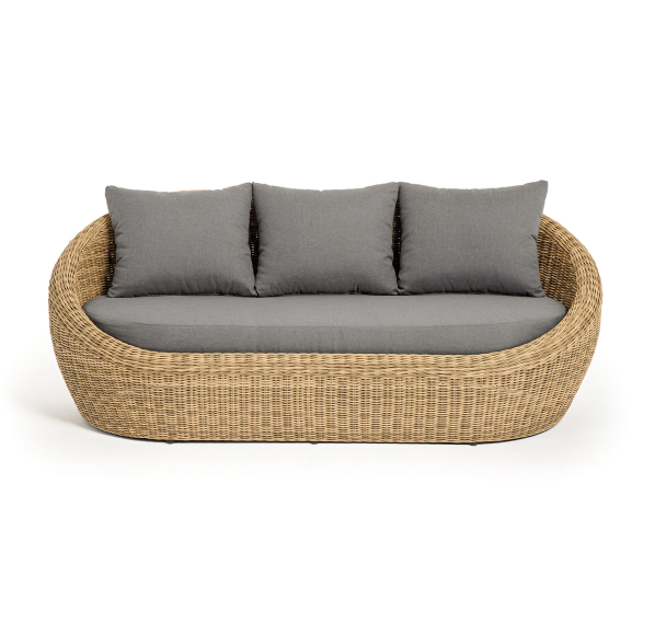 Трехместный диван дополняют мягкие подушки в сером цвете со съёмными чехлами. Тканевые изделия выполнены из прочного полиэстера плотностью 300гр/м2. Материал имеет влагоотталкивающую пропитку.