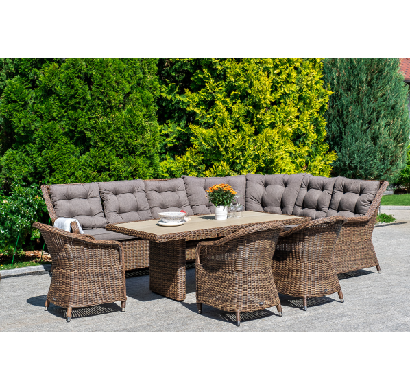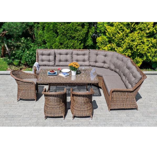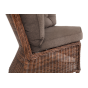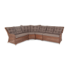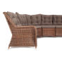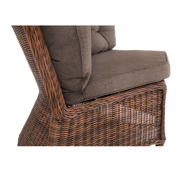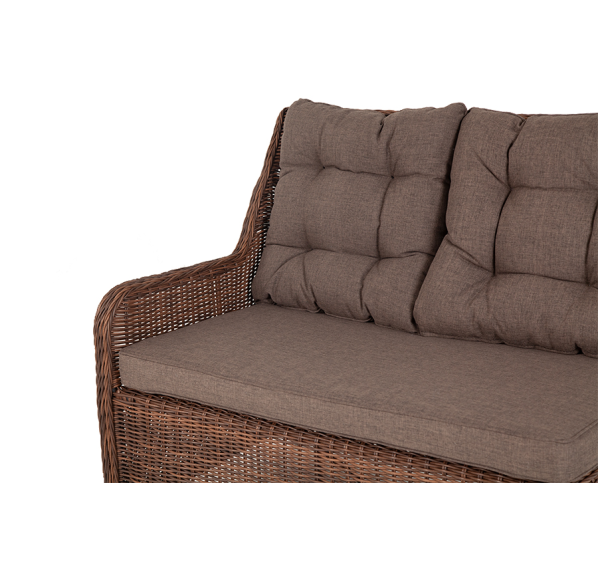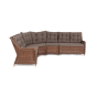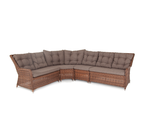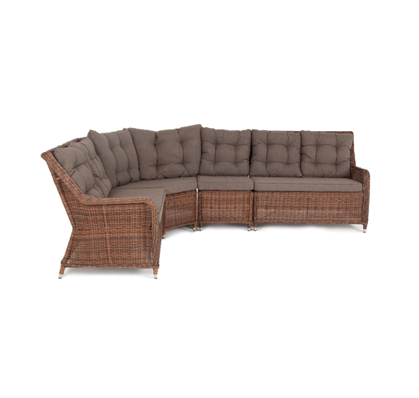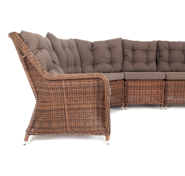 Модульный диван из искусственного ротанга «Бергамо» имеет угловую форму. Модель произведена посредством круглого плетения коричневого цвета и укомплектована мягкими подушками из полиэстера с влагоотталкивающей тканью. В основе дивана - прочный алюминиевый каркас.