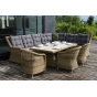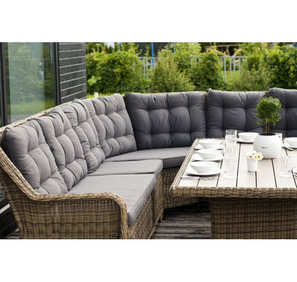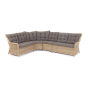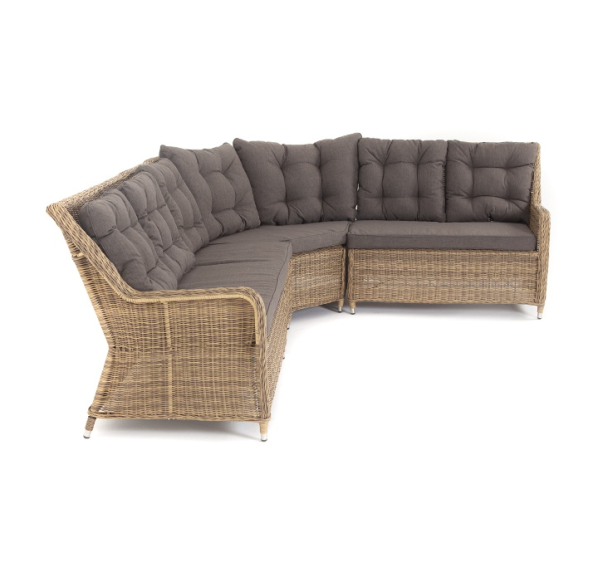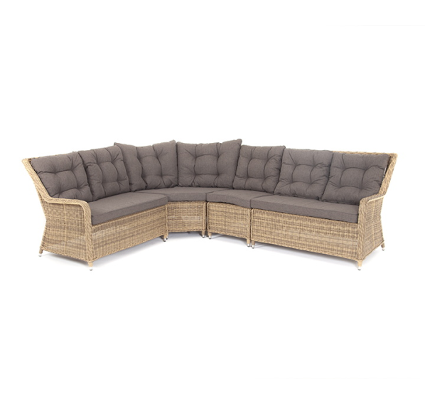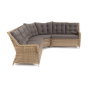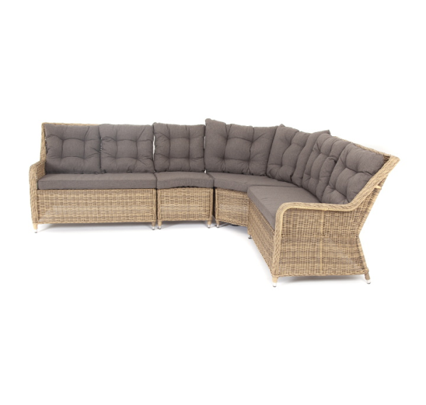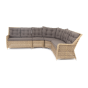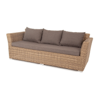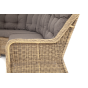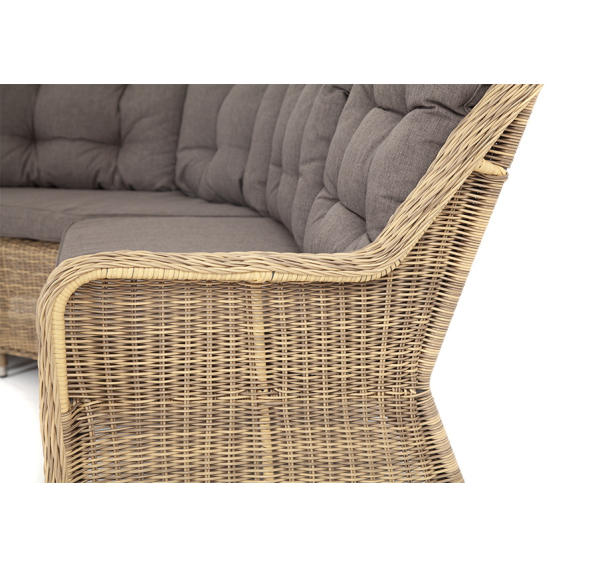 Модульный диван из искусственного ротанга «Бергамо» имеет угловую форму. Модель произведена из круглого искусственного ротанга соломенного цвета и укомплектована мягкими подушками из полиэстера с влагоотталкивающей тканью. В основе дивана - прочный алюминиевый каркас.