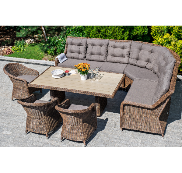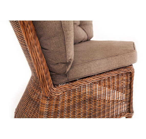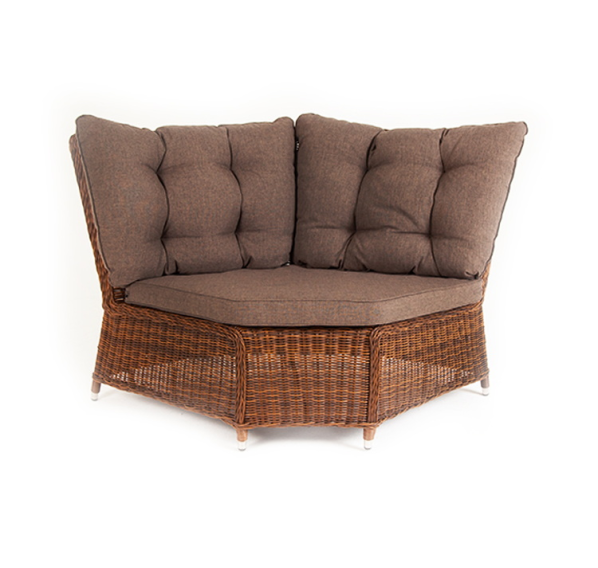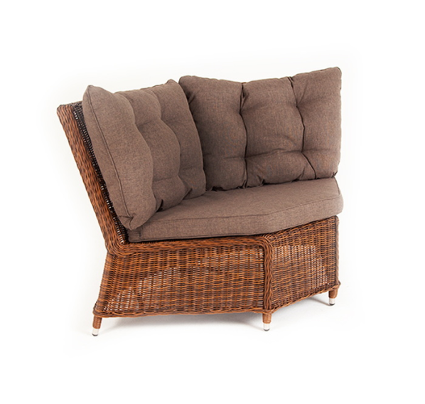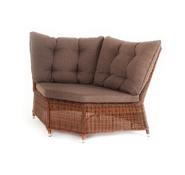 Плетеный угловой диванный модуль «Бергамо» изготовлен из алюминиевого каркаса, вручную оплетенного круглым искусственным ротангом коричневого цвета.
