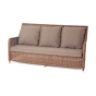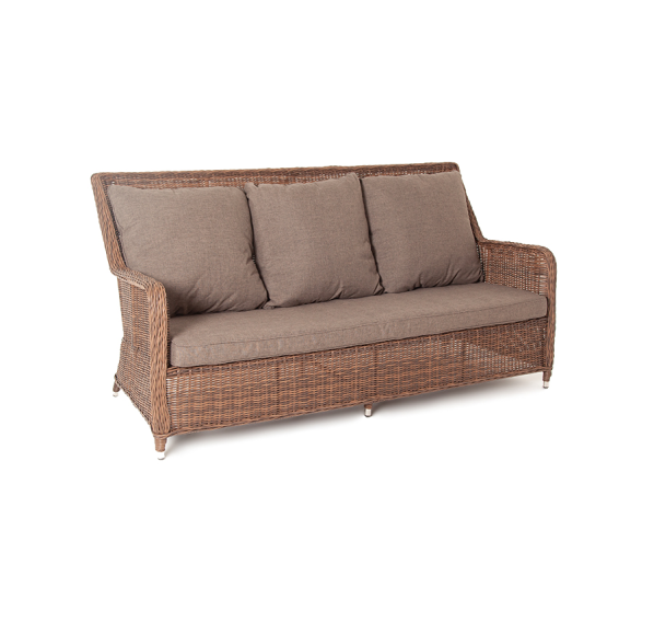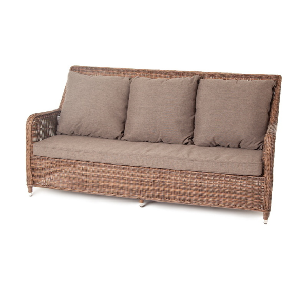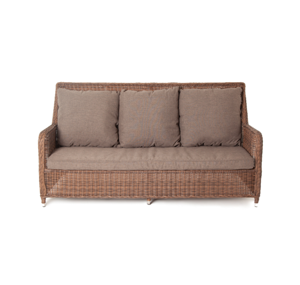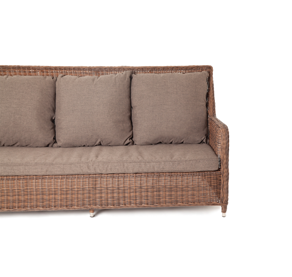 Диван из искусственного ротанга «Гляссе» оснащен каркасом из алюминия, оплетенного круглым искусственным ротангом коричневого цвета.