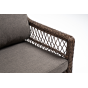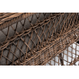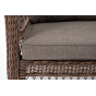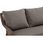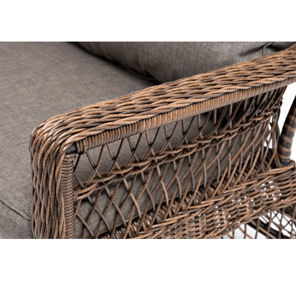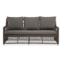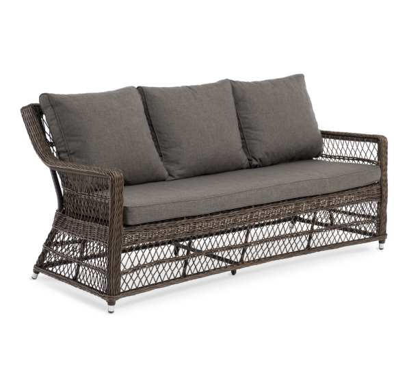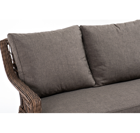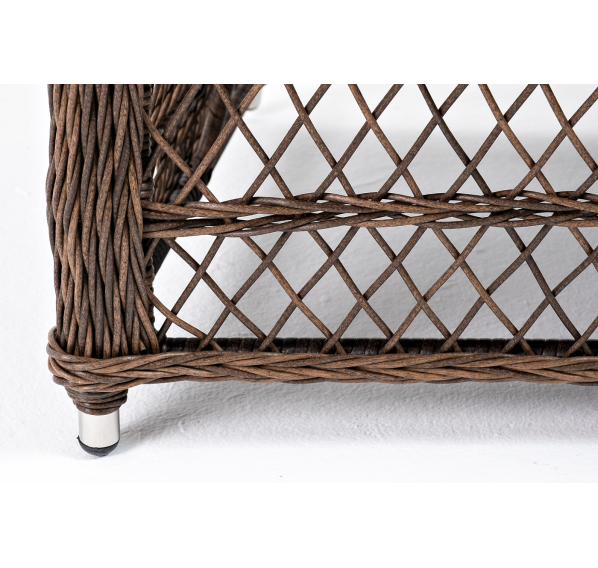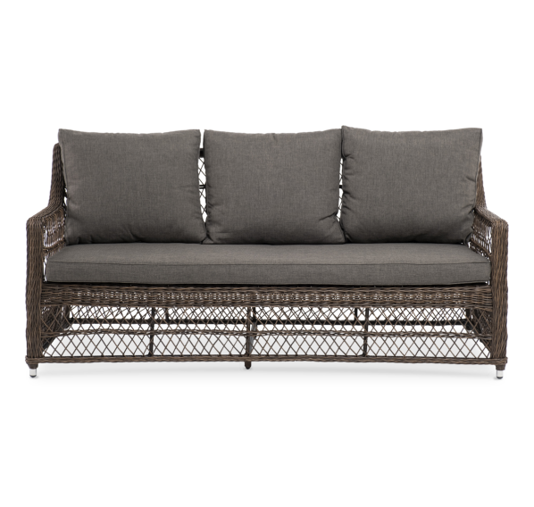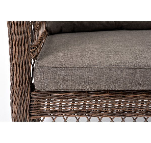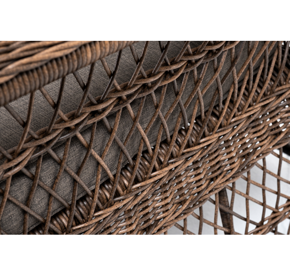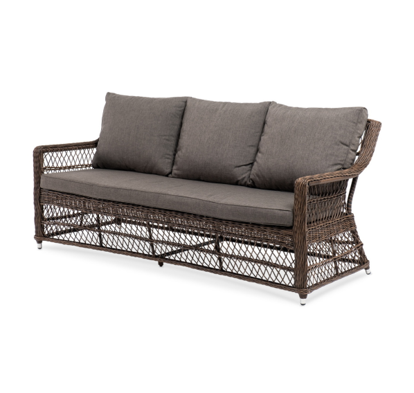 Модель выполнена с помощью ручного круглого плетения из искусственного ротанга. Трехместный диван представлен в коричневом цвете.