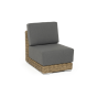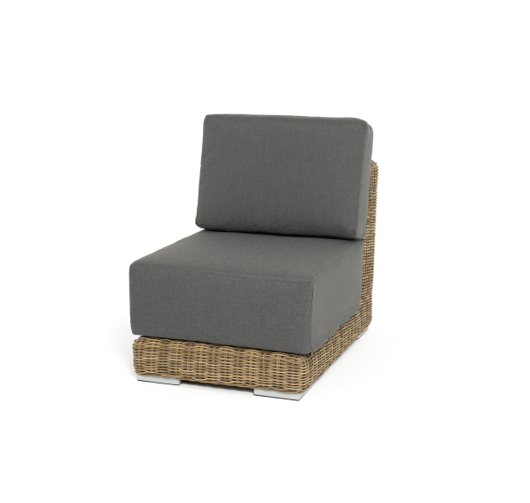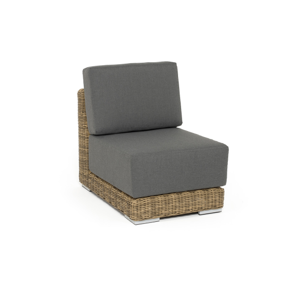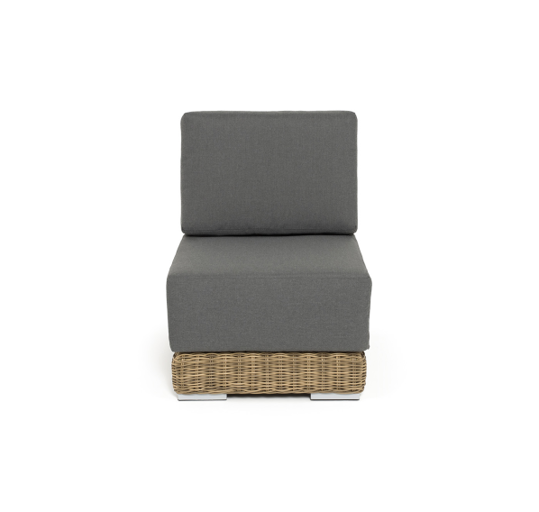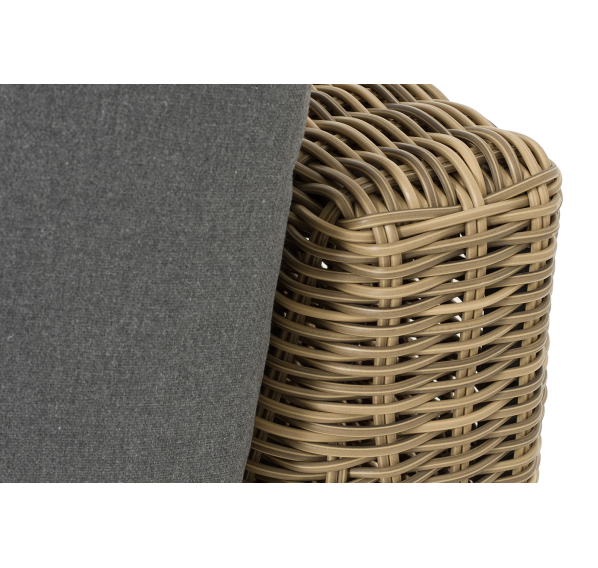 Прямой модуль «Капри», выполненный из круглого искусственного ротанга соломенного оттенка, позволяет использовать не только как самостоятельный элемент, но и быть частью лаунж-зоны, в которую данная модель превосходно интегрируется.