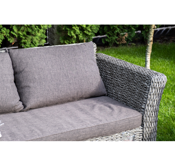 Двухместный диван дополнен несколькими подушками со съёмными чехлами серого цвета. Они изготовлены из прочного полиэстера, плотность которого достигает 300гр/м2. Предусмотрена влагоотталкивающая пропитка ткани для защиты текстильных изделий от намокания.
