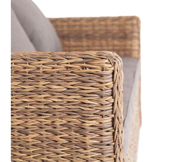 Мебель декорирована ручным плетением, выполненным из искусственного ротанга вида «гиацинт» соломенного цвета.