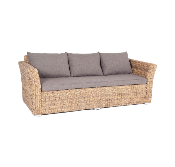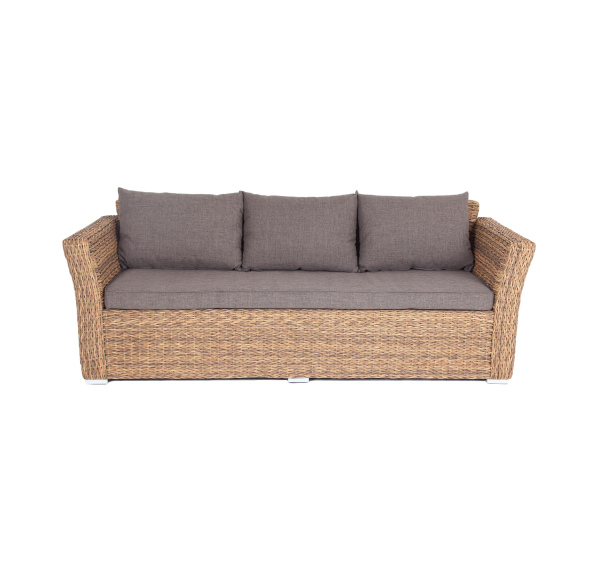 Трехместный диван укомплектован мягкими подушками, которые защищены съёмными чехлами в сером оттенке. При их пошиве используется износостойкий полиэстер, плотность которого достигает 300гр/м2. Предусмотрена влагоотталкивающая пропитка.