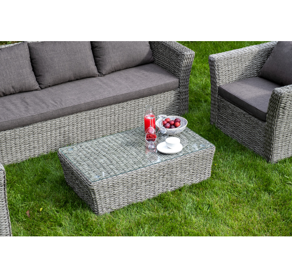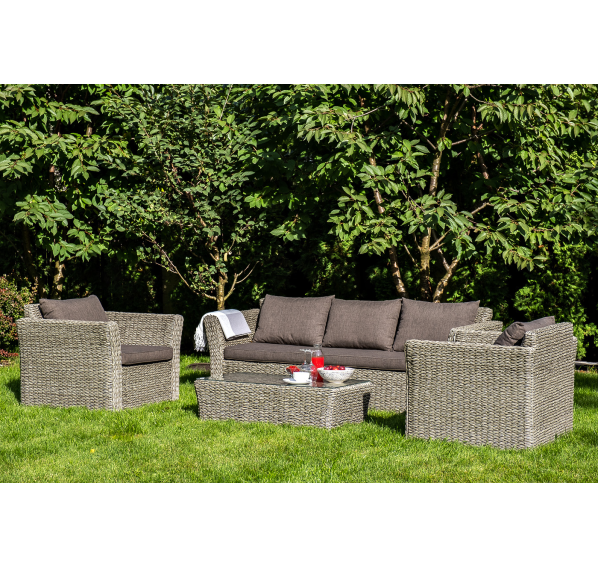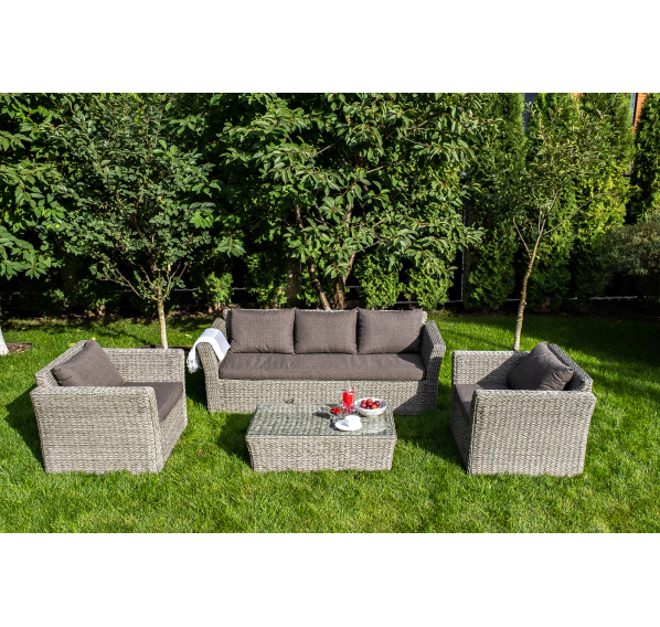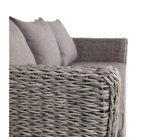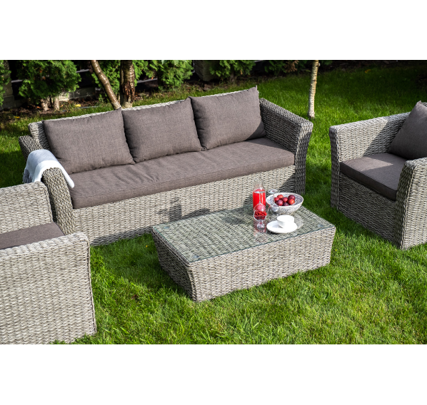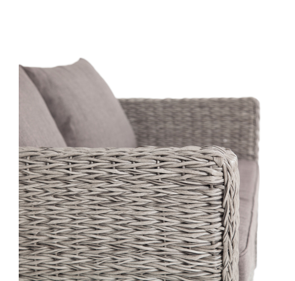 Мебель декорирована ручным плетением, выполненным из искусственного ротанга вида «гиацинт» серого цвета.