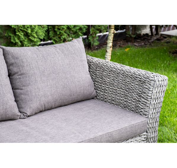 Трехместный диван укомплектован мягкими подушками, которые защищены съёмными чехлами в сером оттенке. При их пошиве используется износостойкий полиэстер, плотность которого достигает 300гр/м2. Предусмотрена влагоотталкивающая пропитка.