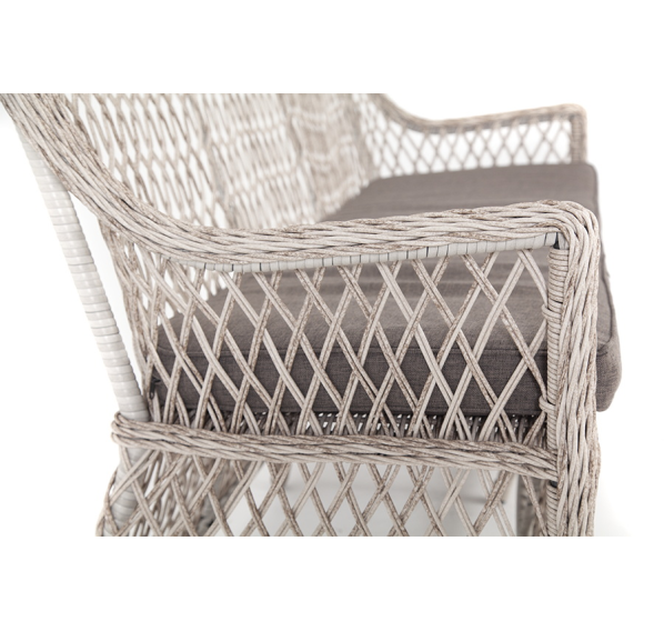 Каркас выполнен из алюминия, выдерживающий до 200 кг. Сверху все вручную оплетено круглым искусственным ротангом высокого качества. Цвет - бежевый. Под солнечным светом изящное плетение приобретает более насыщенный тон.