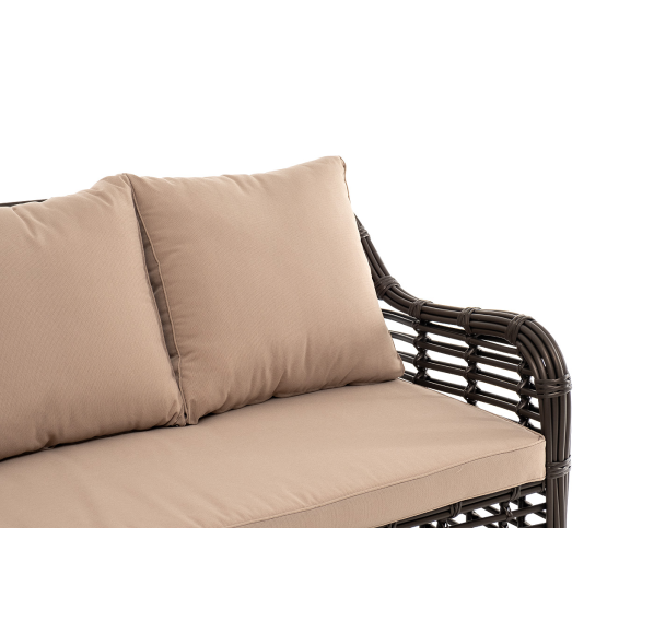 В комплекте с трехместным диваном идут мягкие подушки для комфортного расположения. Чехлы съёмные бежевого цвета из высококлассного полиэстера с плотностью 300гр/м2. Защитные свойства ткани усиливаются при помощи влагоотталкивающей пропитки.