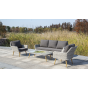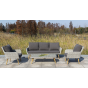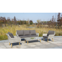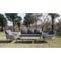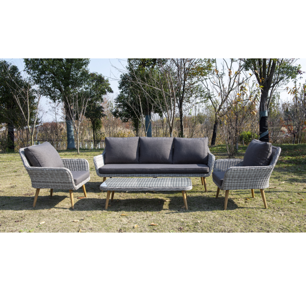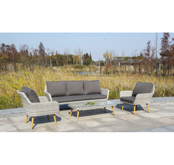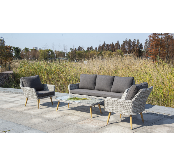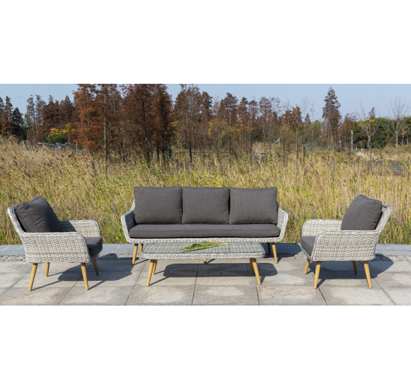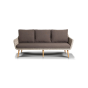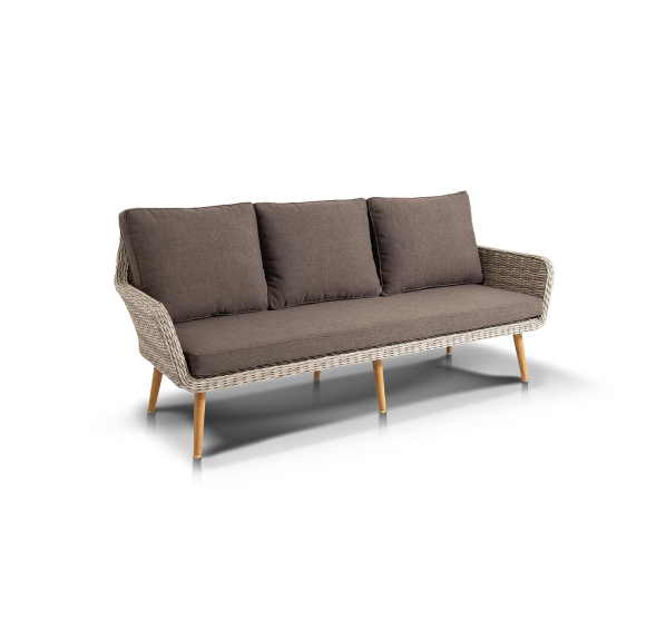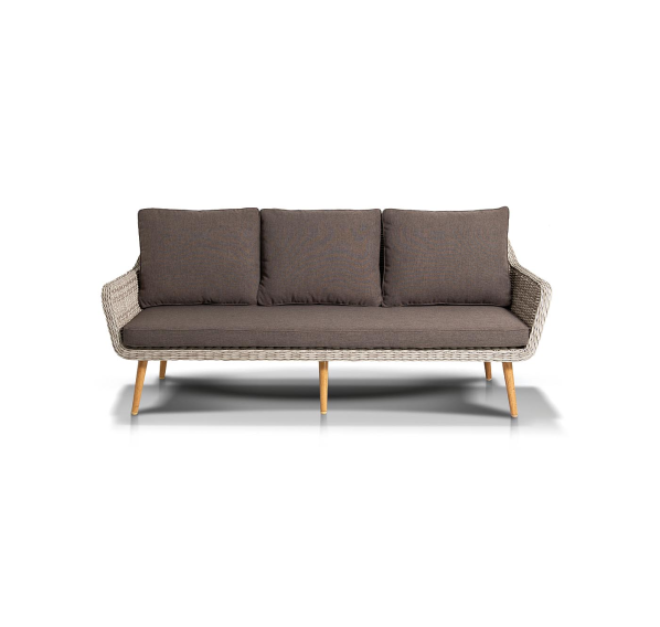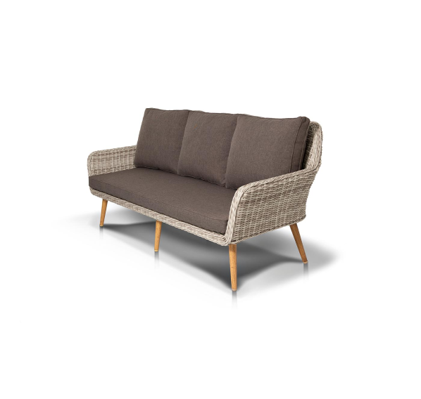 Трехместный диван дополняют мягкие подушки в сером цвете со съёмными чехлами. Тканевые изделия выполнены из прочного полиэстера плотностью 300гр/м2. Материал имеет влагоотталкивающую пропитку.