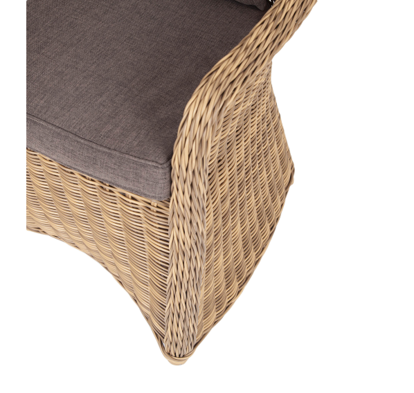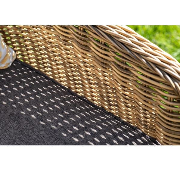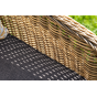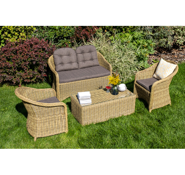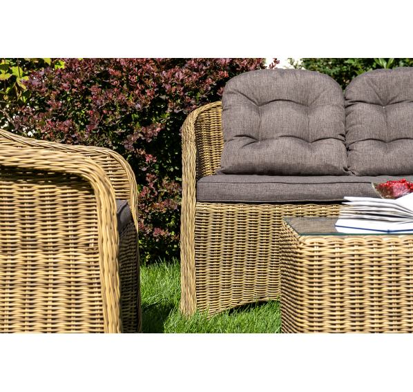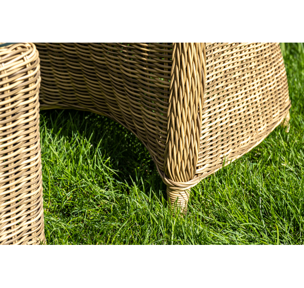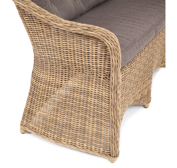 Диван выполнен из круглого искусственного ротанга, в основе алюминиевый каркас. Цвет соломенный.
