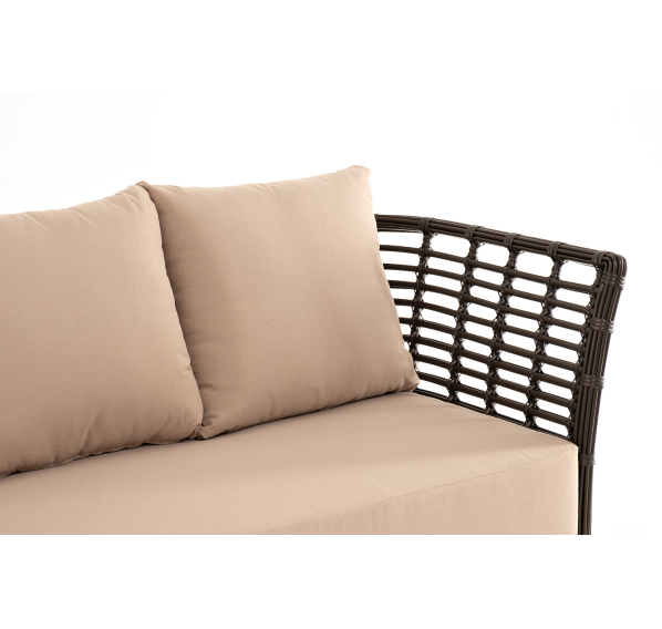 В комплекте с трехместным диваном идут мягкие подушки для комфортного расположения. Чехлы съёмные бежевого цвета из высококлассного полиэстера с плотностью 300гр/м2. Защитные свойства ткани усиливаются при помощи влагоотталкивающей пропитки.