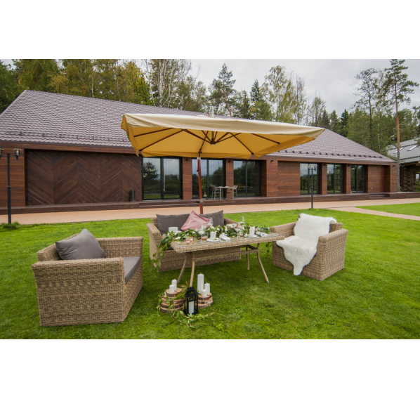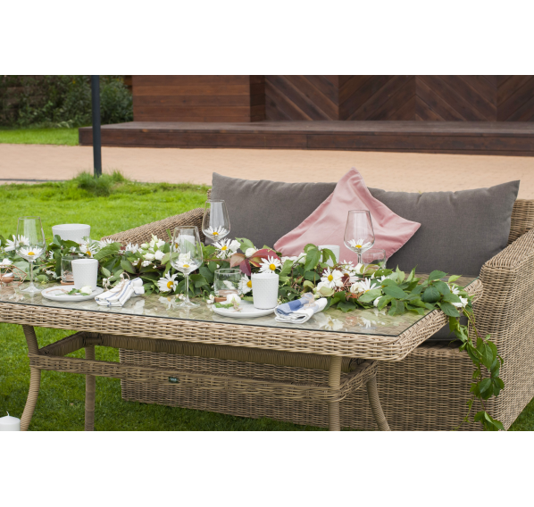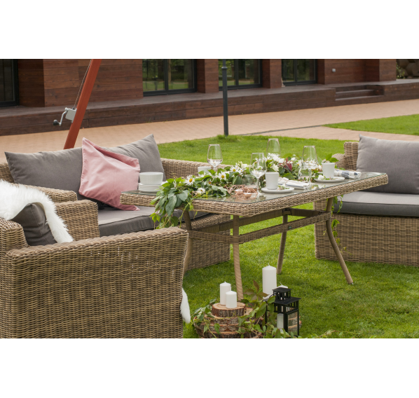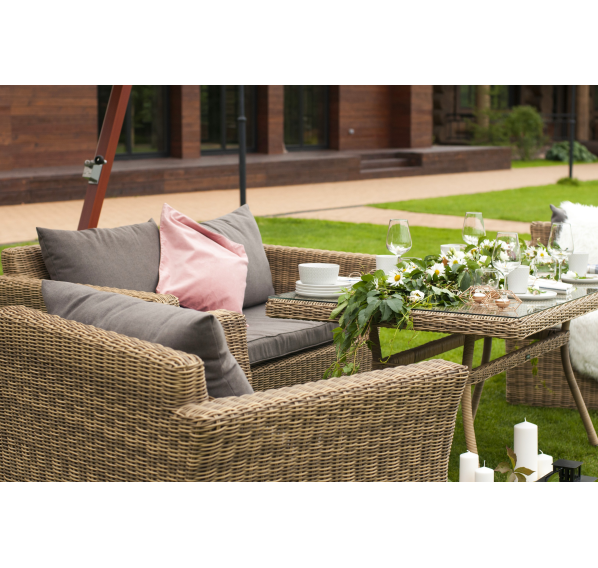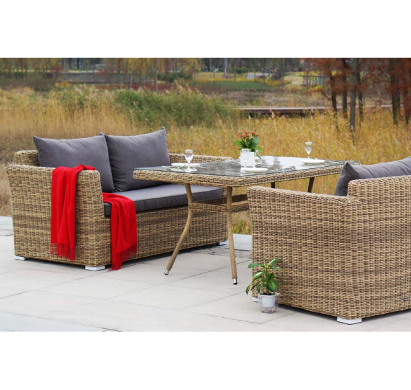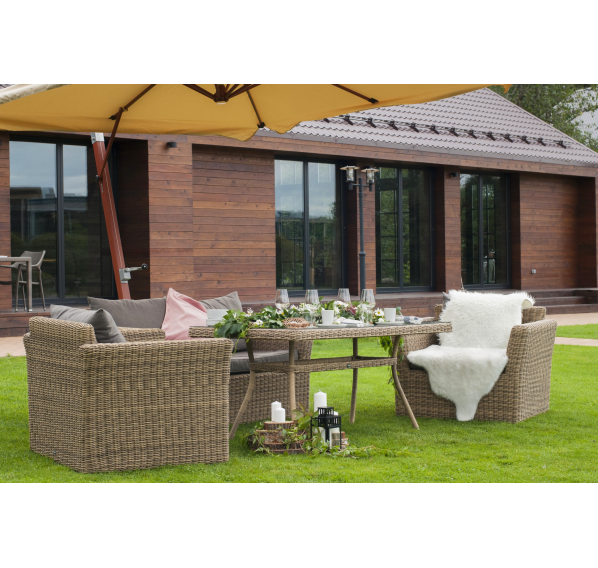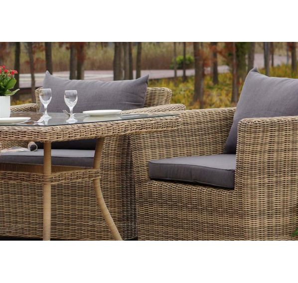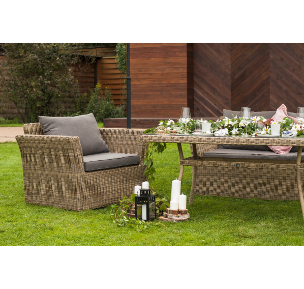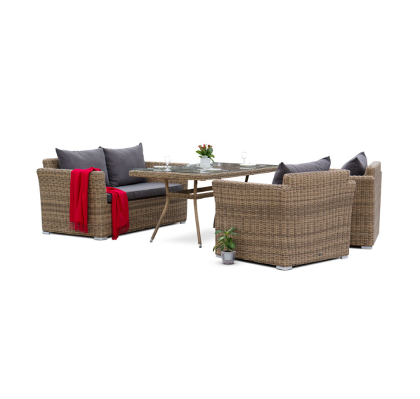 Мебель изготовлена из легкого, но прочного алюминия, оплетенного долговечным искусственным ротангом природного соломенного оттенка. На диване и креслах предусмотрены подушки с чехлами из полиэстера серого цвета. Съёмные чехлы пропитаны специальными влагоотталкивающими средствами, которые способы защитить от намокания.