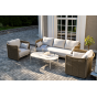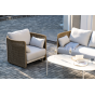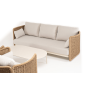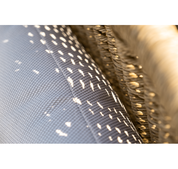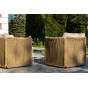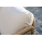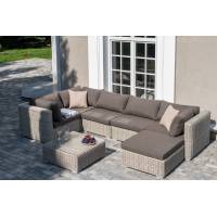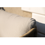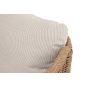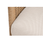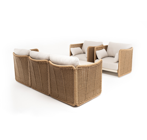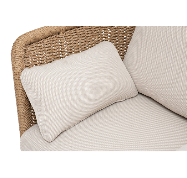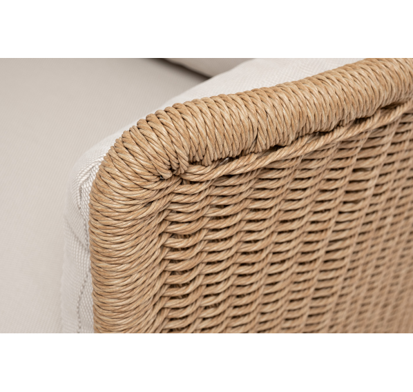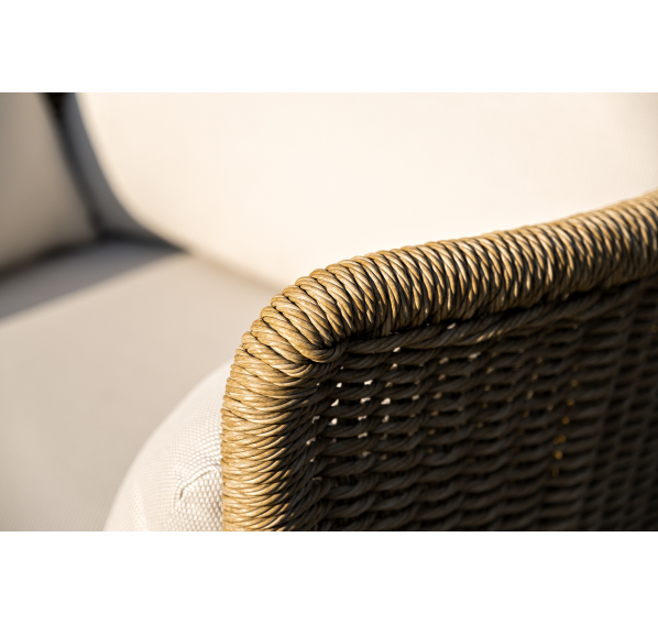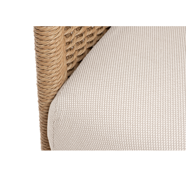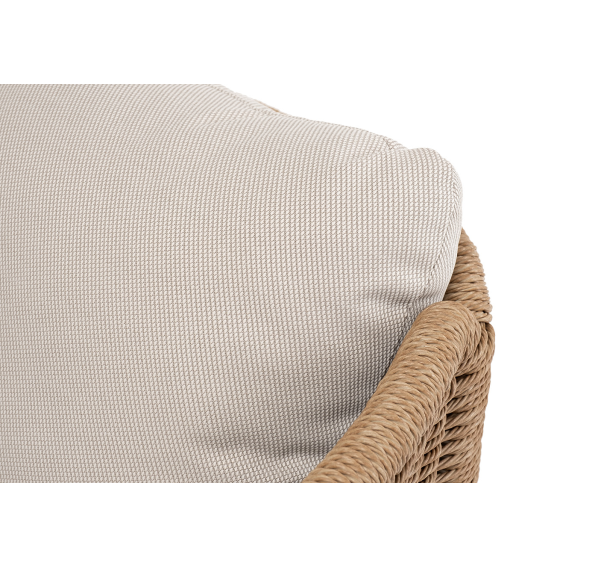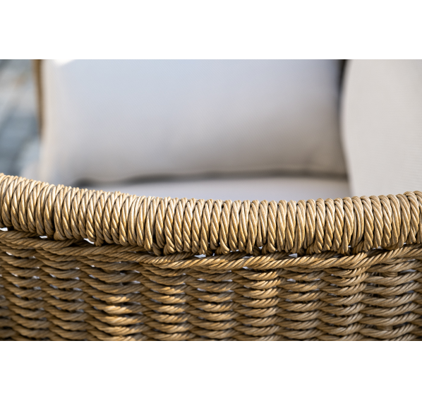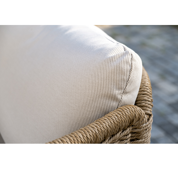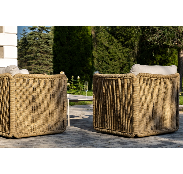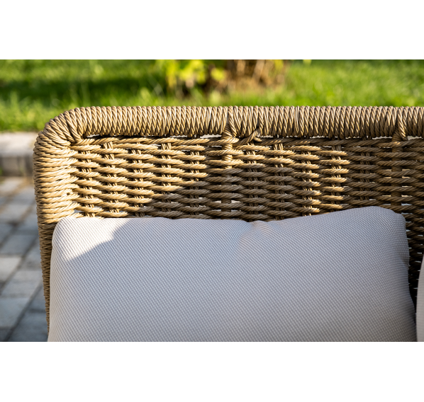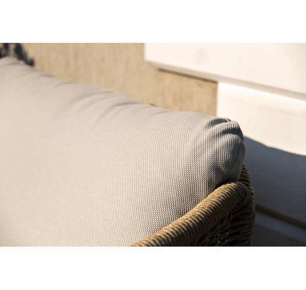 Плетеная мебель дополнена удобными подушками в бежевых чехлах. При их изготовлении используют полиэстер, плотность – 300гр/м2. Он обрабатывается влагоотталкивающей пропиткой для повышения защитных свойств материала.