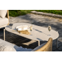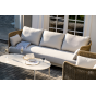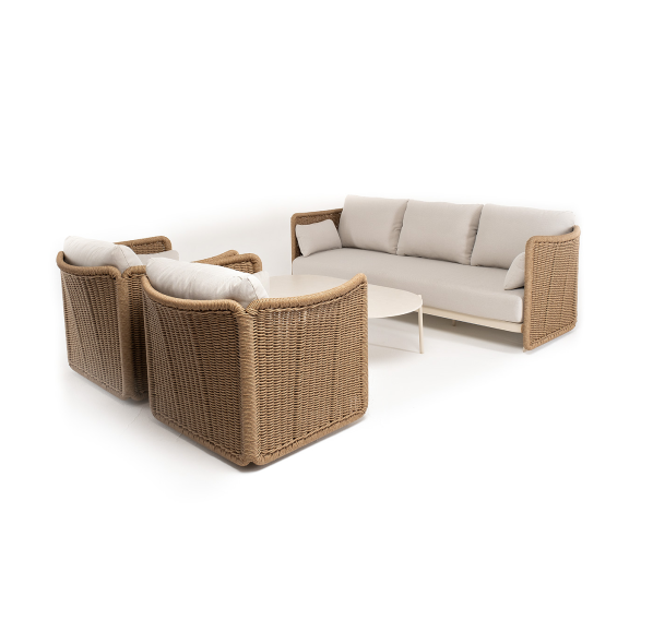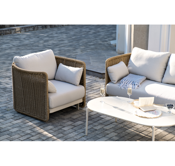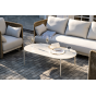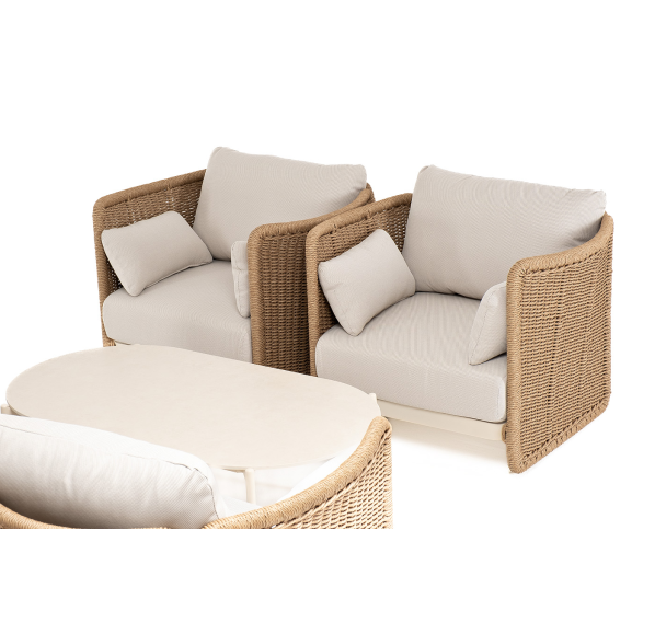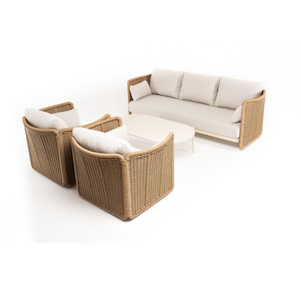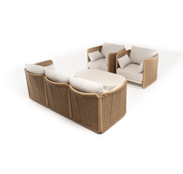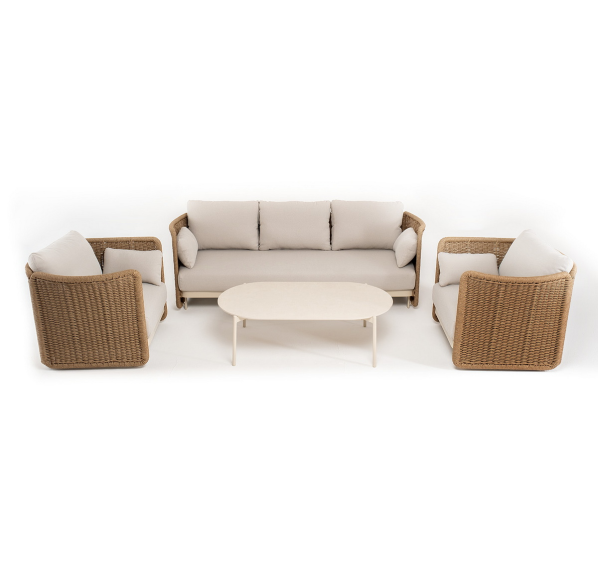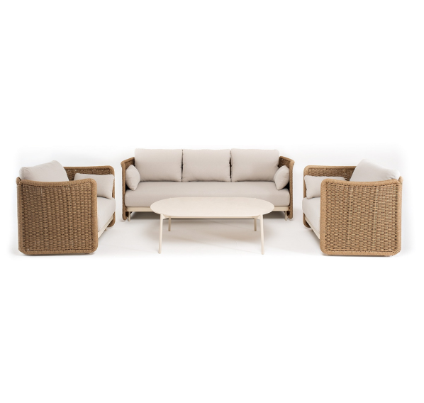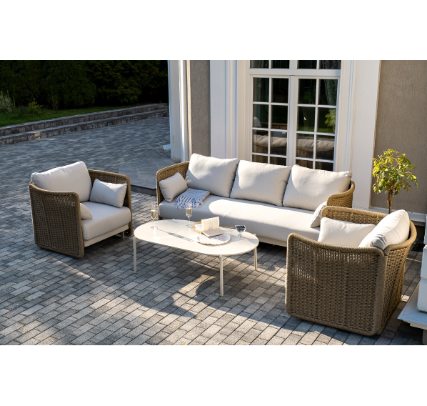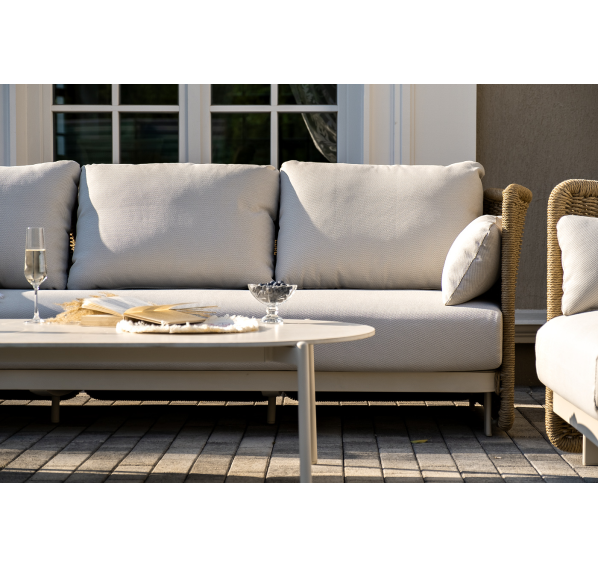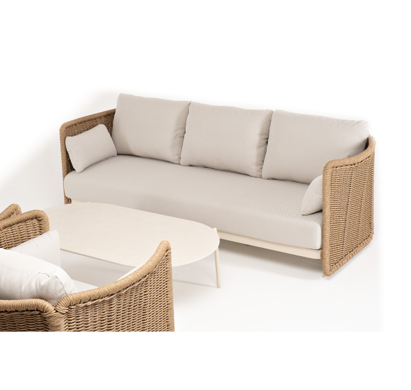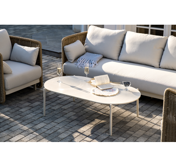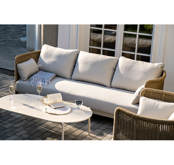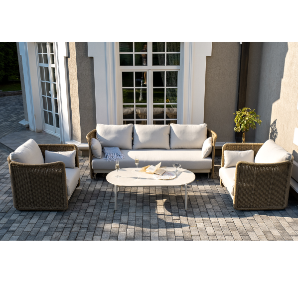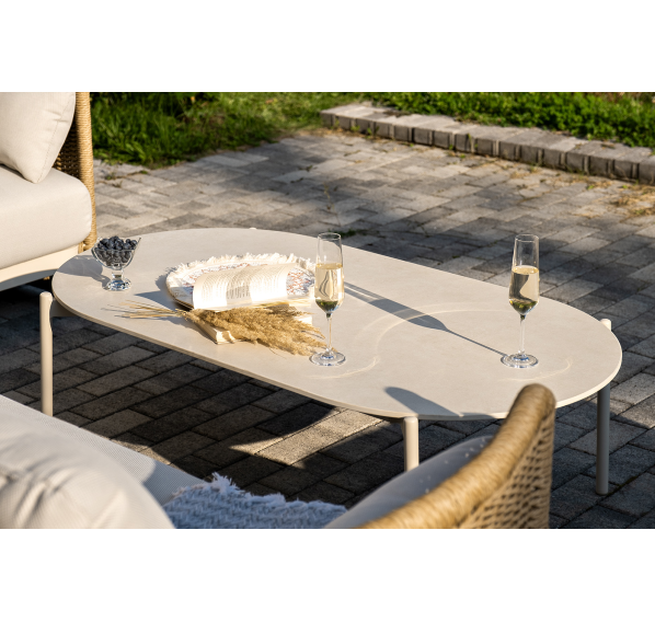 Журнальный столик выполнен из алюминия, окрашенного износостойкой краской, а его оплетка выполнена из круглого искусственного ротанга ручного плетения - 7 мм соломенного цвета. Столешница - овальная, выполнена из искусственного камня белового цвета.