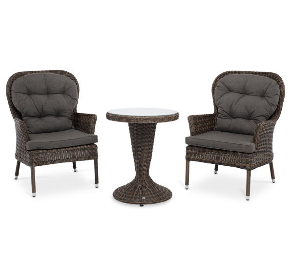 Плетение выполнено вручную круглым искусственным ротангом коричневого цвета, кресло укомплектовано подушками из 100% полиэстера, которые пропитаны специальным составом, обладающим влагоотталкивающим свойством.