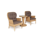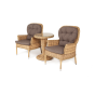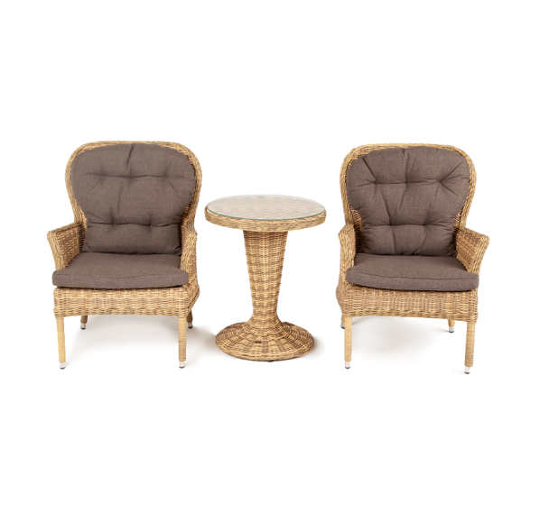 Плетение выполнено вручную искусственным ротангом соломенного цвета, кресло укомплектовано подушками из 100% полиэстера, которые пропитаны специальным составом, обладающим влагоотталкивающим свойством.
