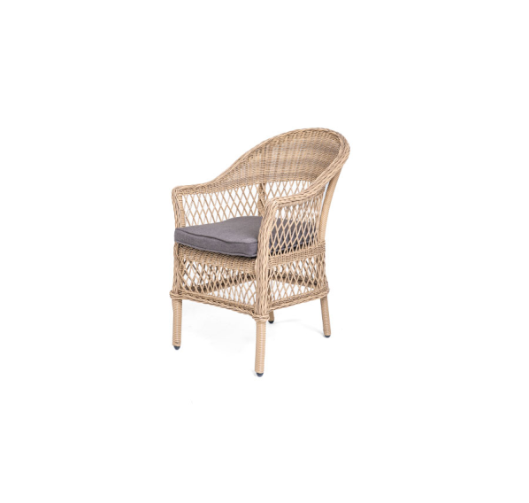 Алюминий используется при создании прочного каркаса мебели. Оформлен ручным плетением из круглого искусственного ротанга соломенного цвета.