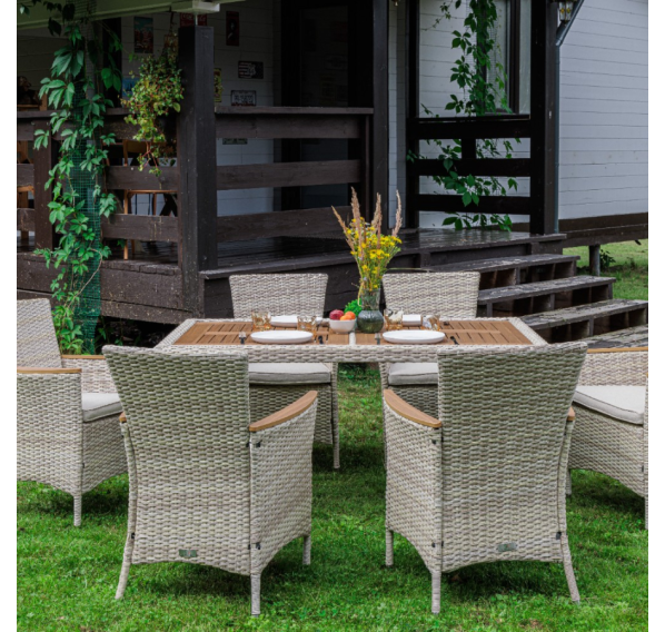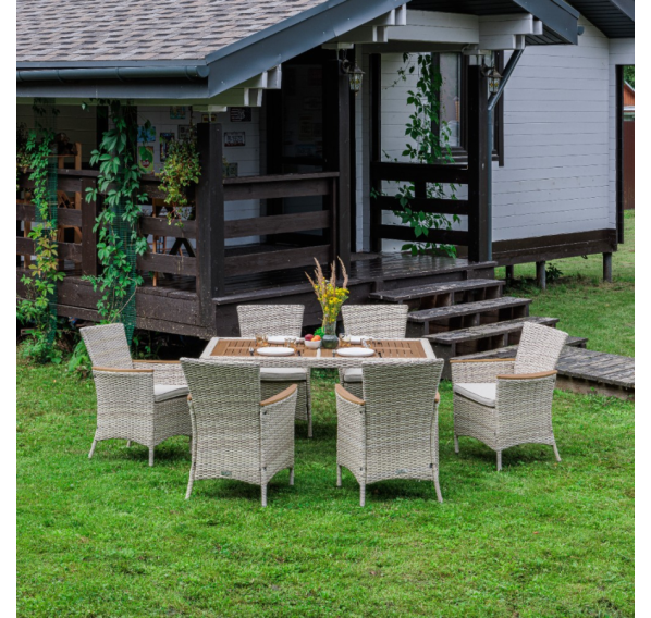 Включает в себя шесть кресел из искусственного ротанга на стальном каркасе и прочный стол.