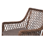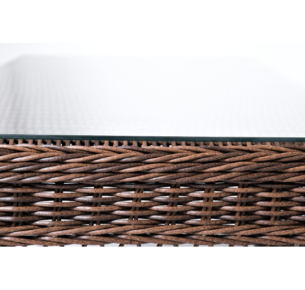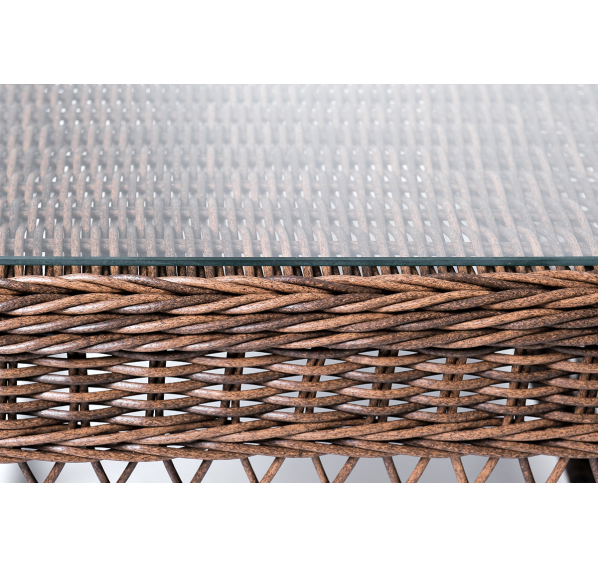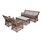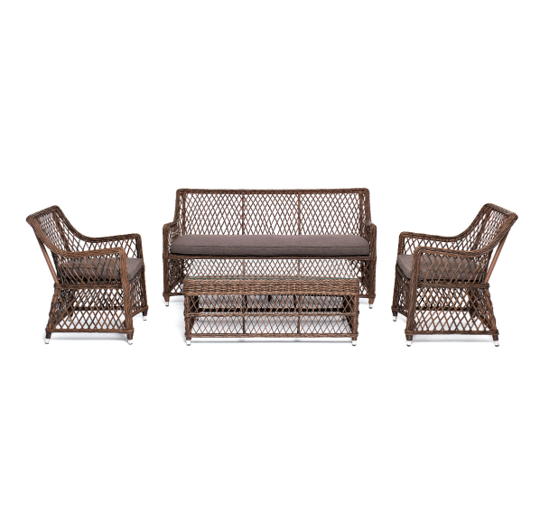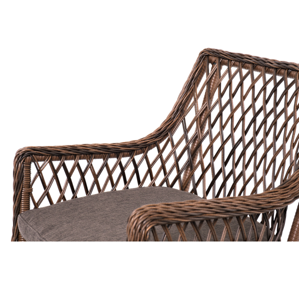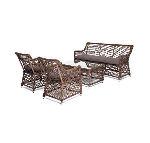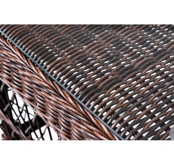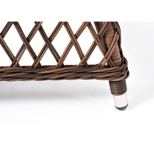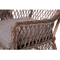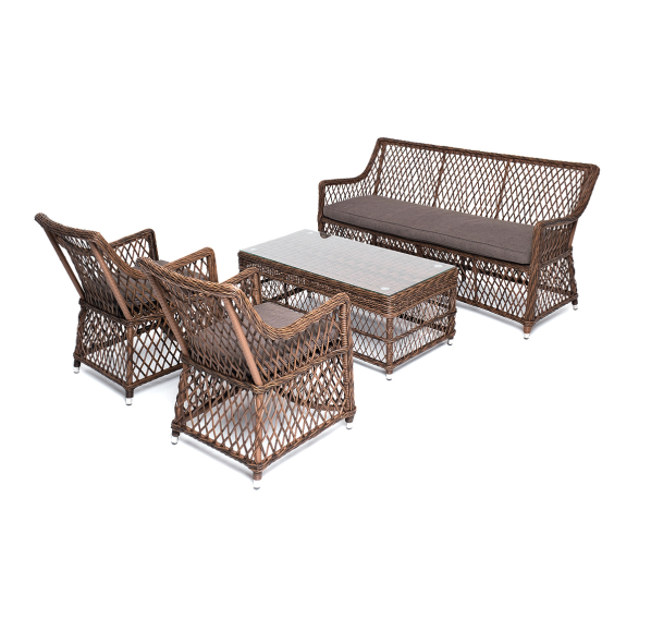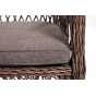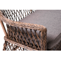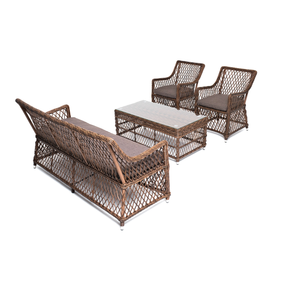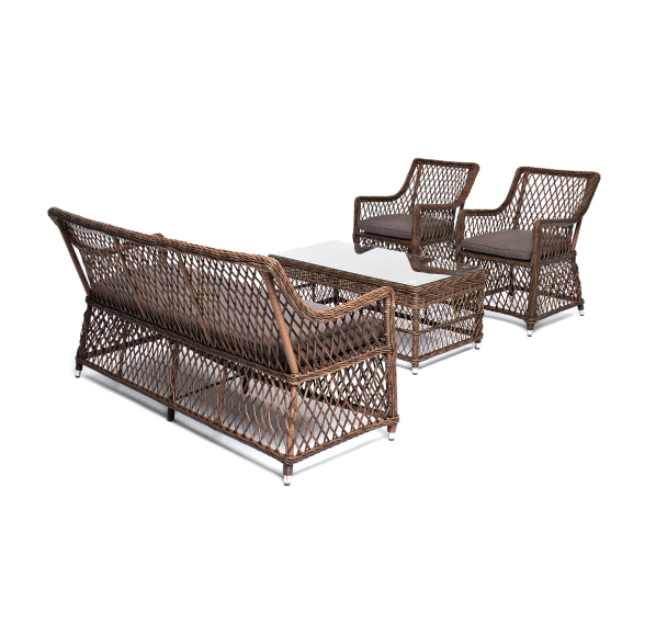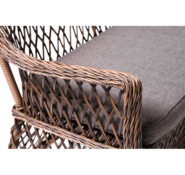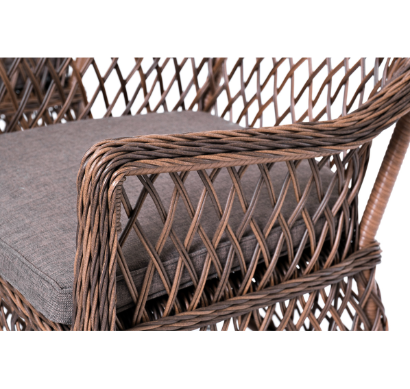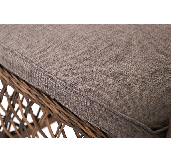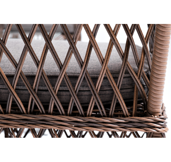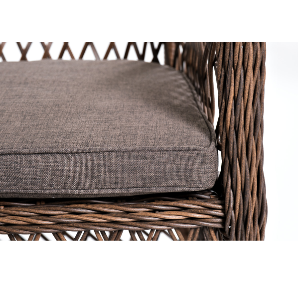Оплетка выполнена вручную искусственным ротангом коричневого цвета, диван и кресло укомплектованы подушками из 100% полиэстера, которые пропитаны специальным составом, обладающим влагоотталкивающим свойством.