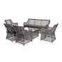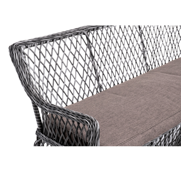 Оплетка выполнена вручную искусственным ротангом в цвете графит, диван и кресло укомплектованы подушками из 100% полиэстера, которые пропитаны специальным составом, обладающим влагоотталкивающим свойством.