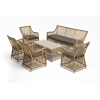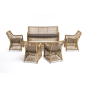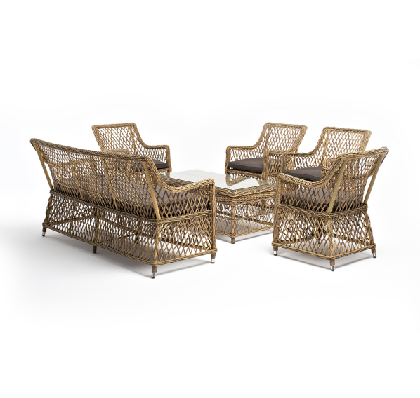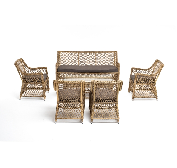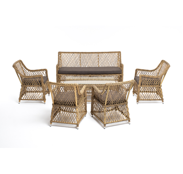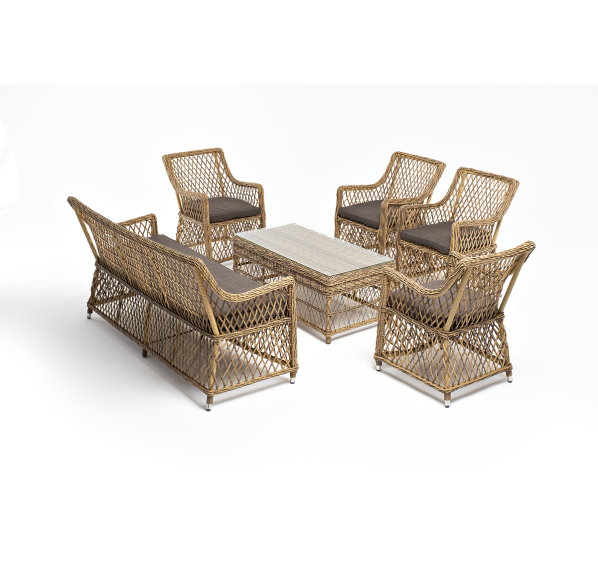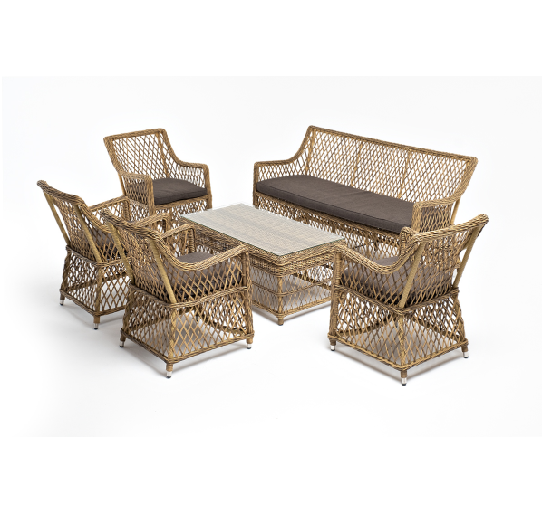Оплетка выполнена вручную искусственным ротангом соломенного цвета, диван и кресло укомплектованы подушками из 100% полиэстера, которые пропитаны специальным составом, обладающим влагоотталкивающим свойством.