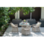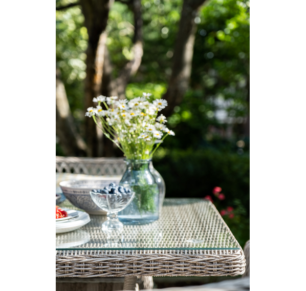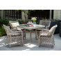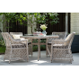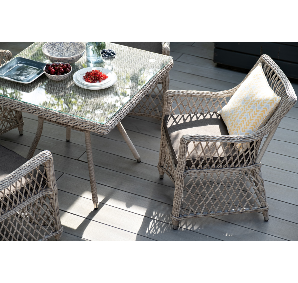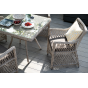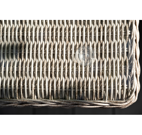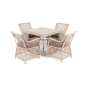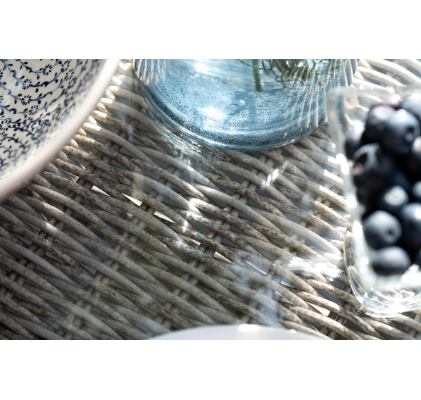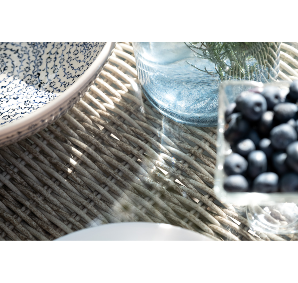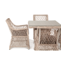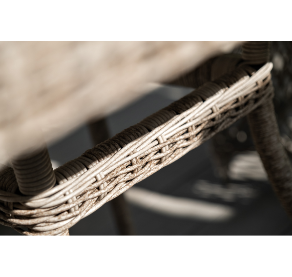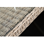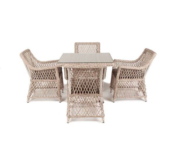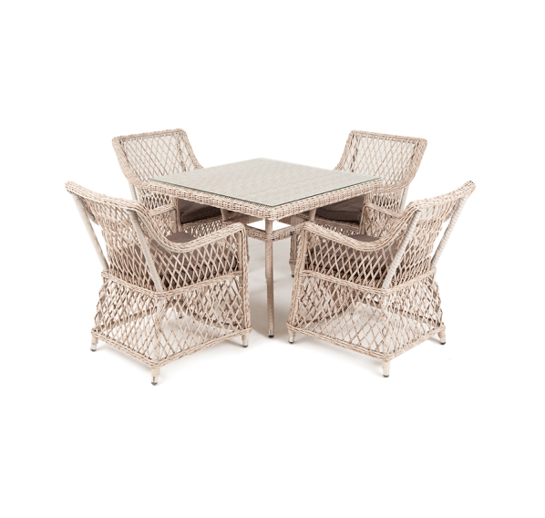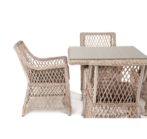 Каркас мебели выполнен из прочного и легкого алюминия, оплетенного вручную искусственным ротангом бежевого цвета, столешница – закаленное стекло.
