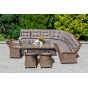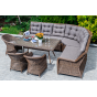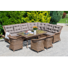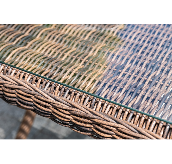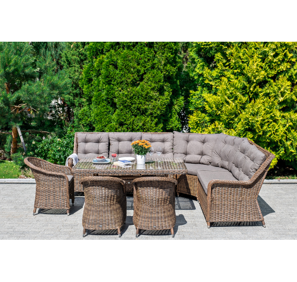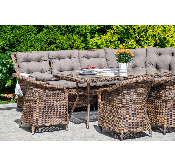 Угловая модульная лаунж-зона с обеденным столом и тремя стульями. Искусственный ротанг, плетение круглое, цвет коричневый, алюминиевый каркас. Столешница из закаленого стекла 5 мм.