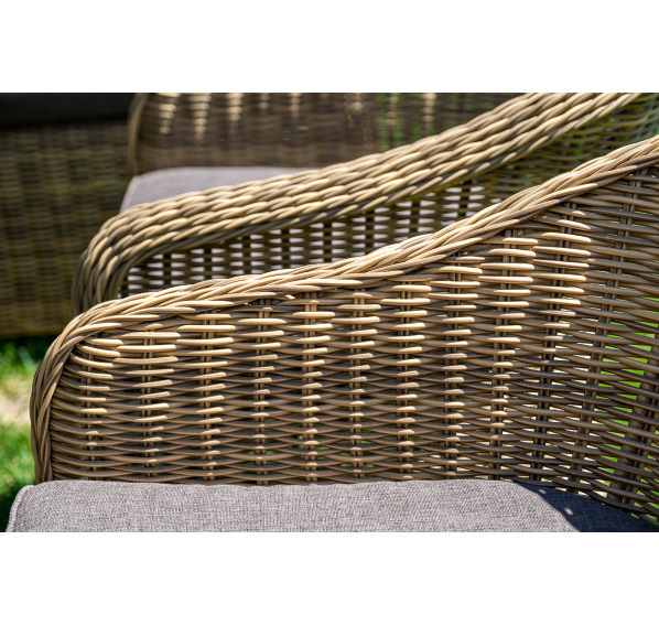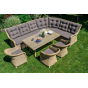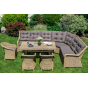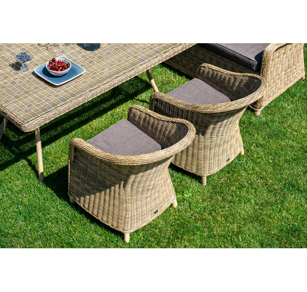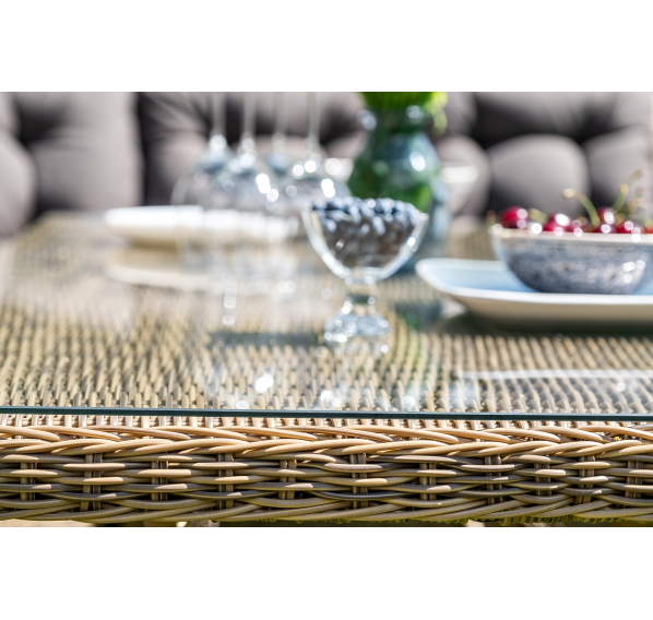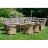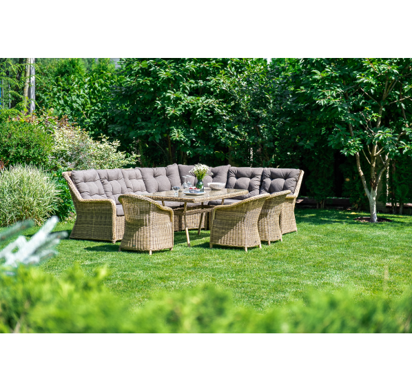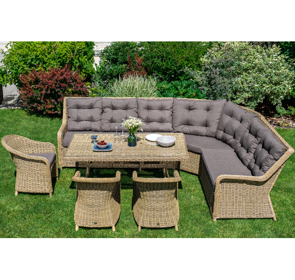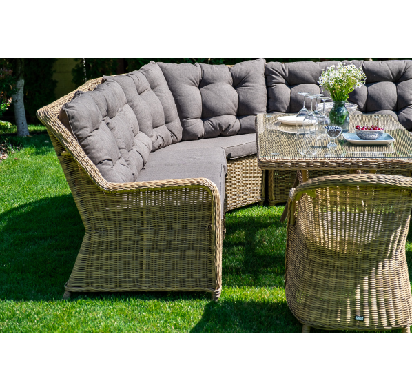 Угловая модульная лаунж зона с обеденным столом и тремя стульями. Искусственный ротанг, плетение круглое, цвет соломенный, алюминиевый каркас. Столешница из закаленого стекла 5 мм.
