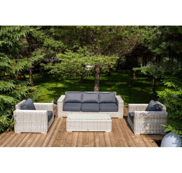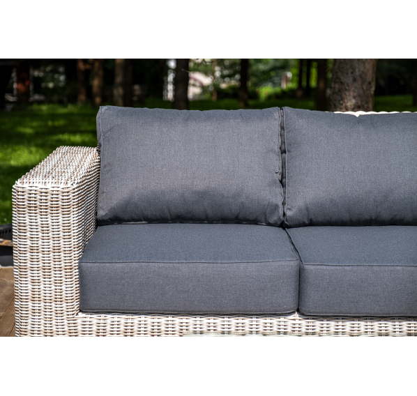 На креслах и диване предусмотрены мягкие подушки, съёмные чехлы которых пошиты из полиэстера, плотностью 300гр/м2. Ткань в обязательном порядке пропитывается влагоотталкивающими составами.